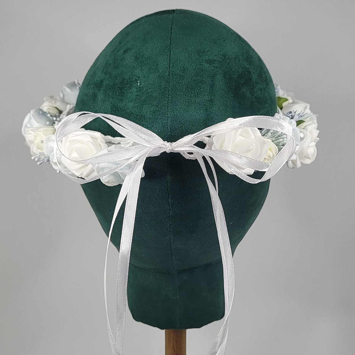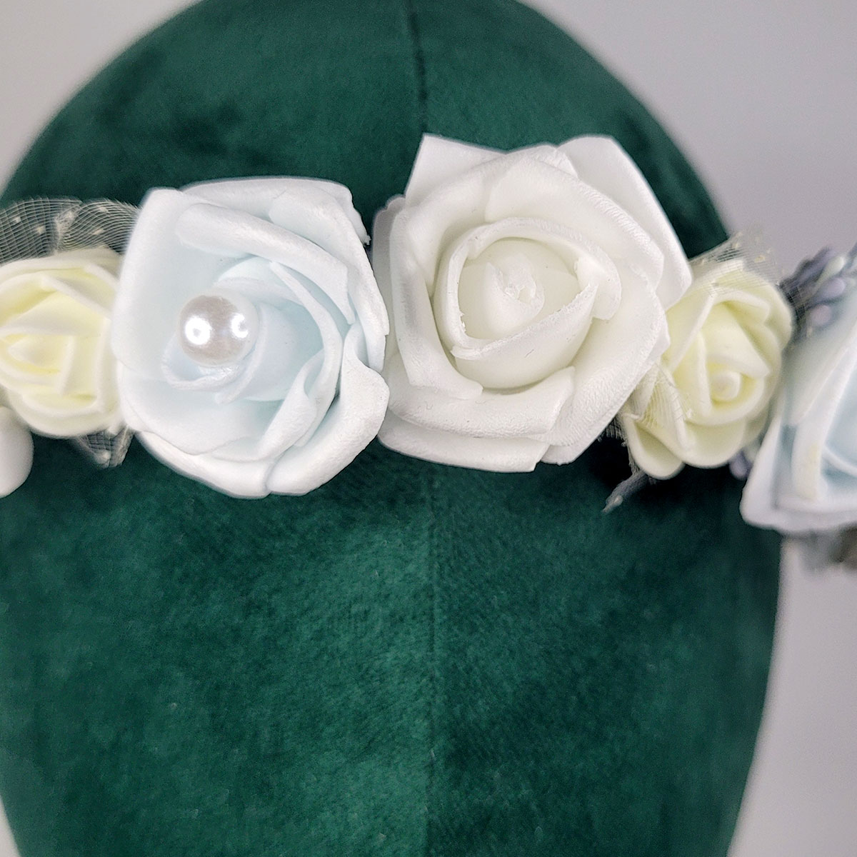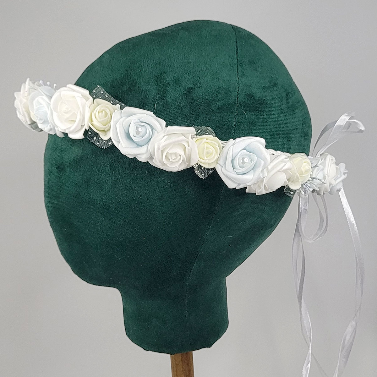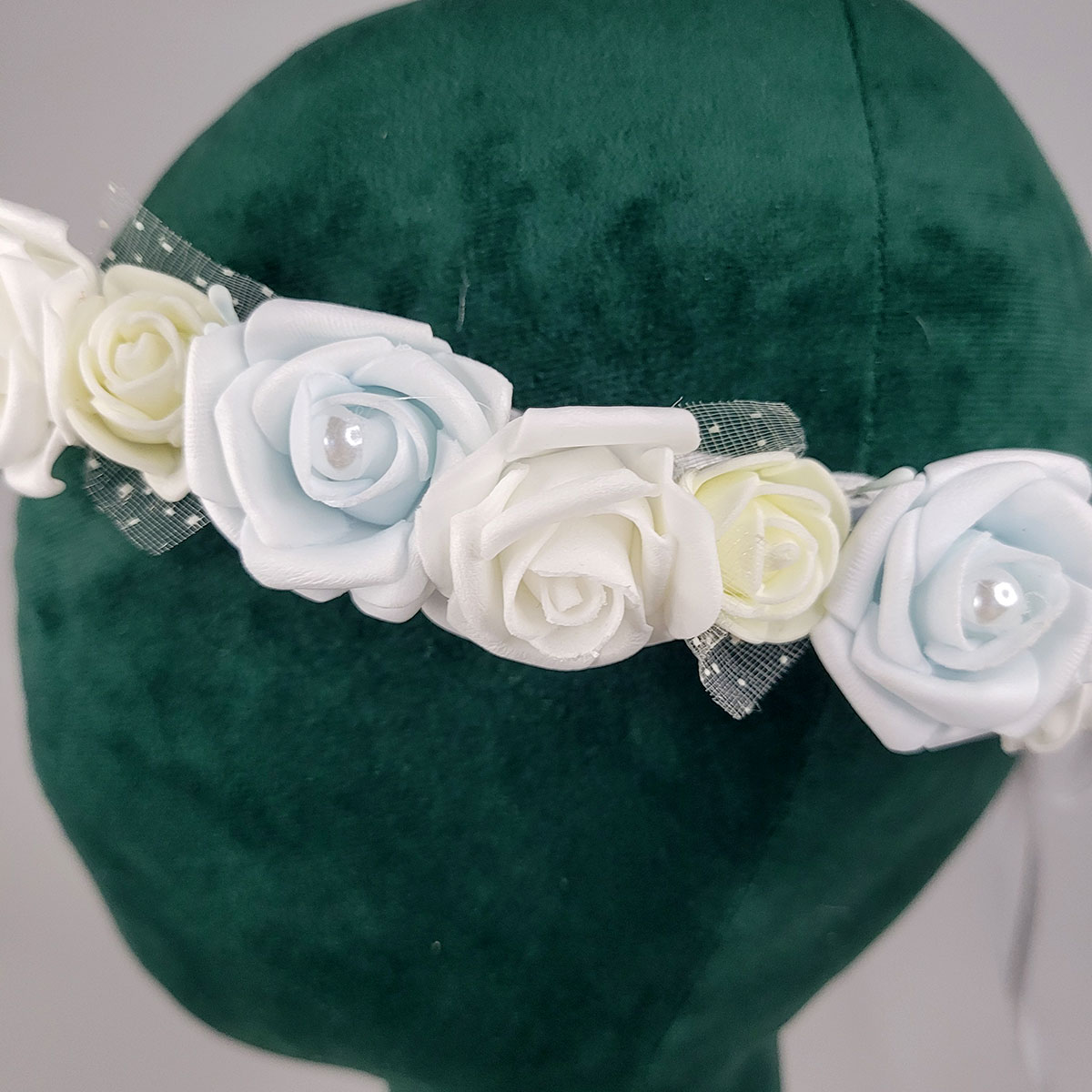 Delikaty wianek na głowę, wykonany ręcznie z największą starannością i dbałością o szczegół. Dekoracja składa się z delikatnych piankowych różyczek, w kolorze błękitnym z perełkami, białym i kremowym. Wewnątrz bawełniana koronka, z tyłu wiązany na satynowe wstążki. Wianek ma niezamknięty obwód, co pozwala na dopasowanie do głowy (minimalny obwód głowy – 54 cm). Piękna dekoracja głowy na komunię, wesele itp.