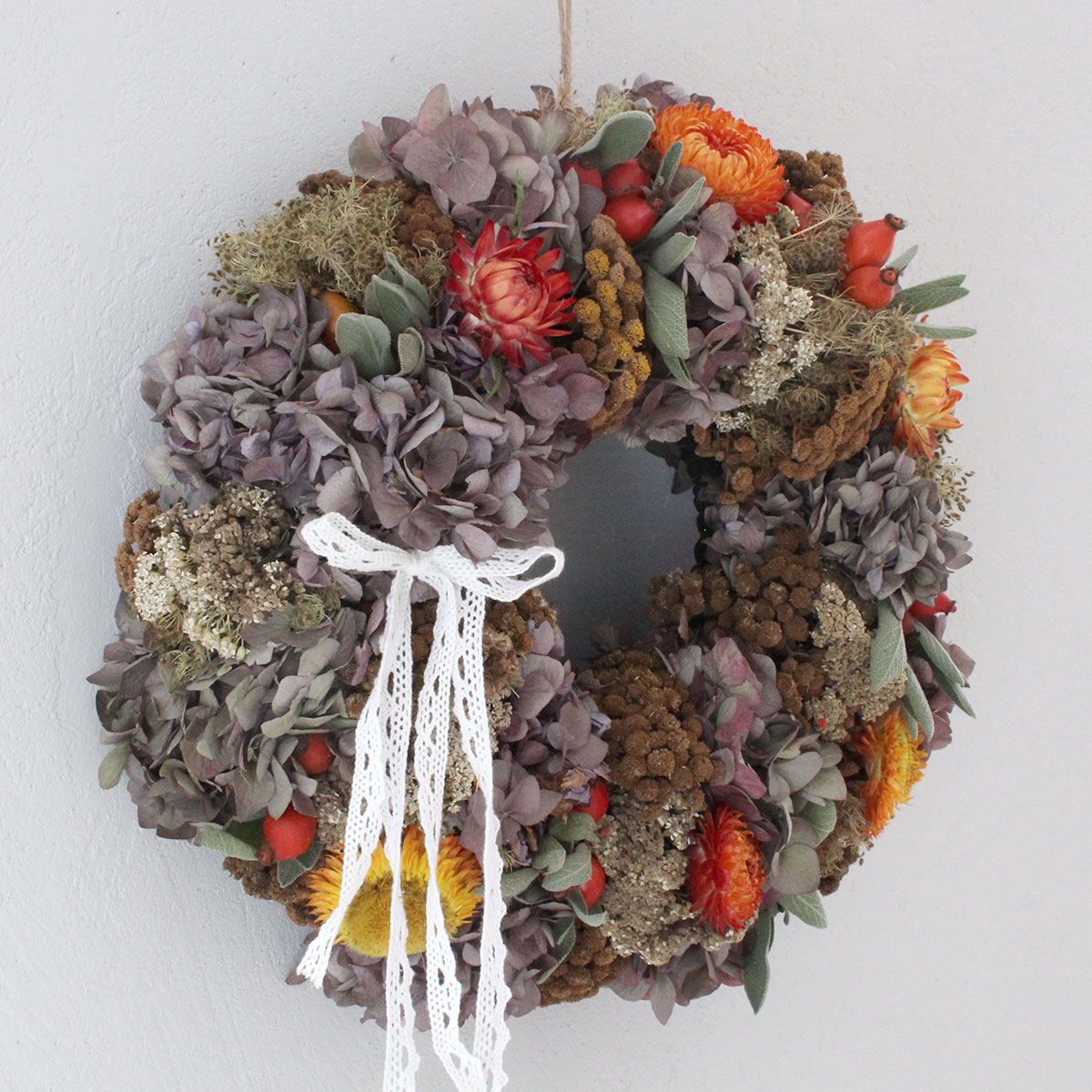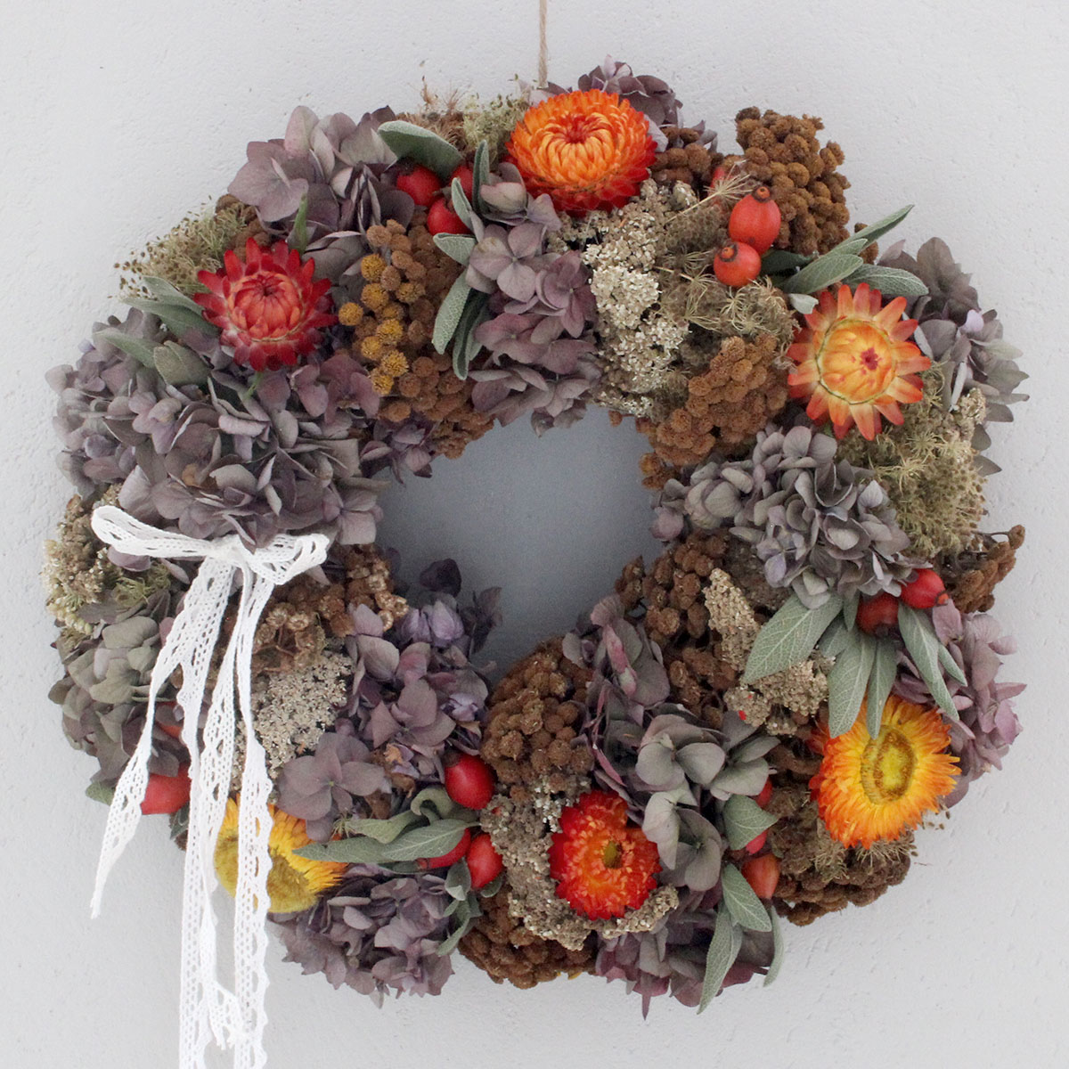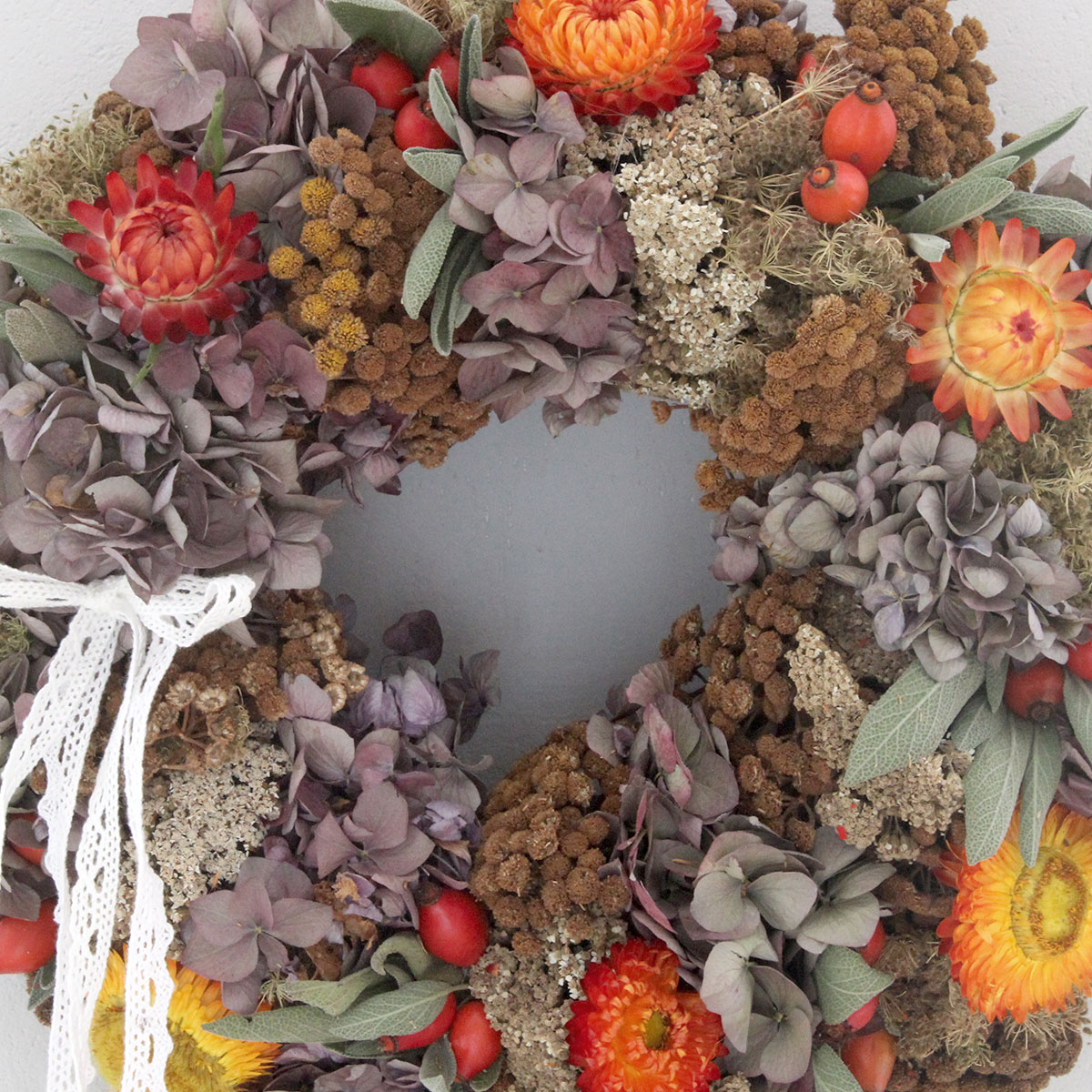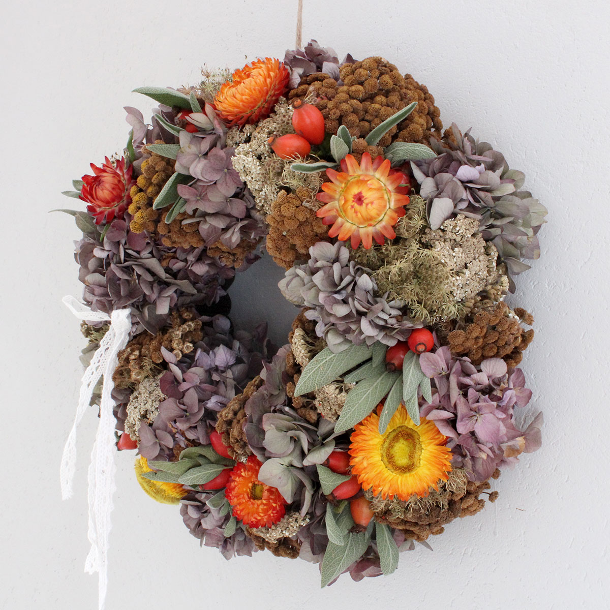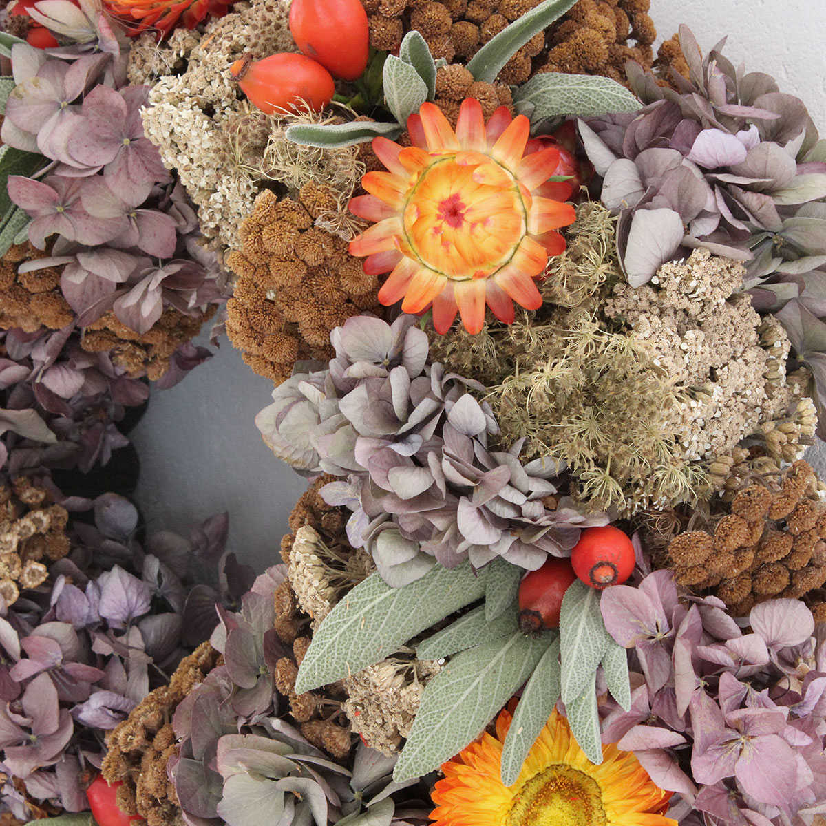 Dekoracja zachwyca bogactwem kolorów i faktur. Fioletowe hortensje tworzą delikatne tło, które pięknie kontrastuje z intensywną pomarańczą i żółcią kocanek. Wrotycz i krwawnik dodają subtelnych akcentów, a owoce dzikiej róży wprowadzają energetyczną, czerwoną barwę. Całość uzupełniają listki szałwii, które podkreślają naturalny charakter wianka i nadają mu świeżości. Dzięki temu każdy element tej kompozycji harmonijnie ze sobą współgra, tworząc dekorację idealną na jesienne dni.
