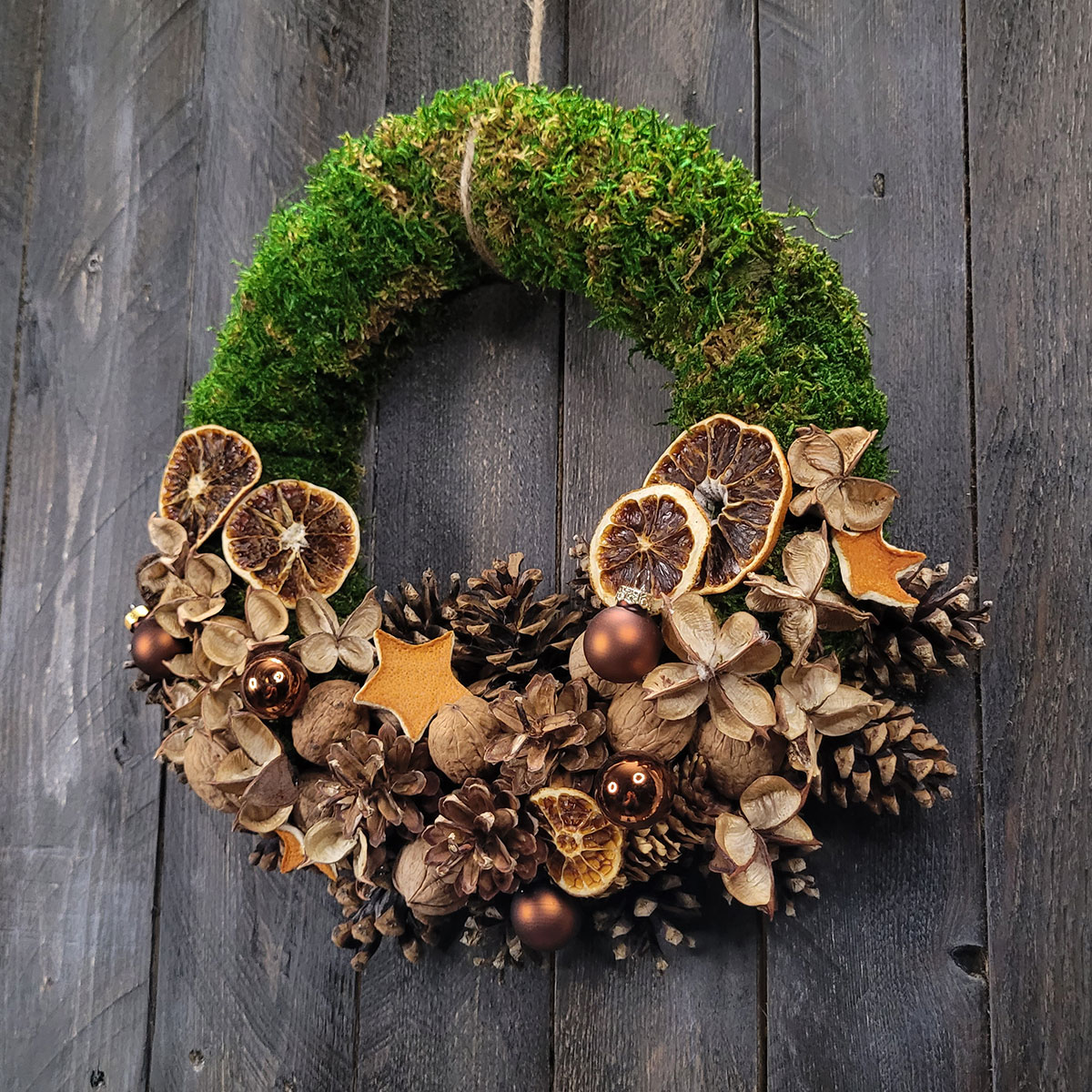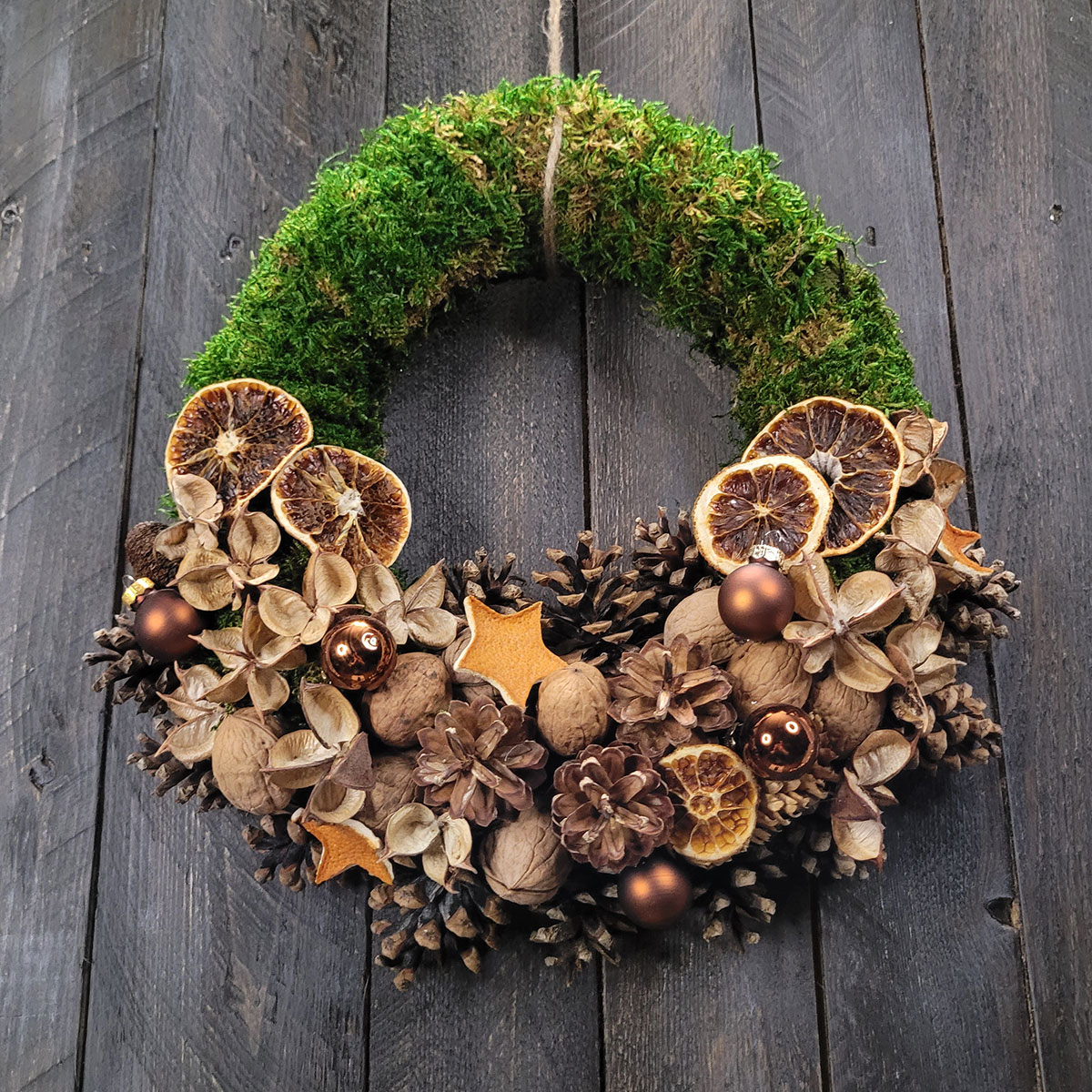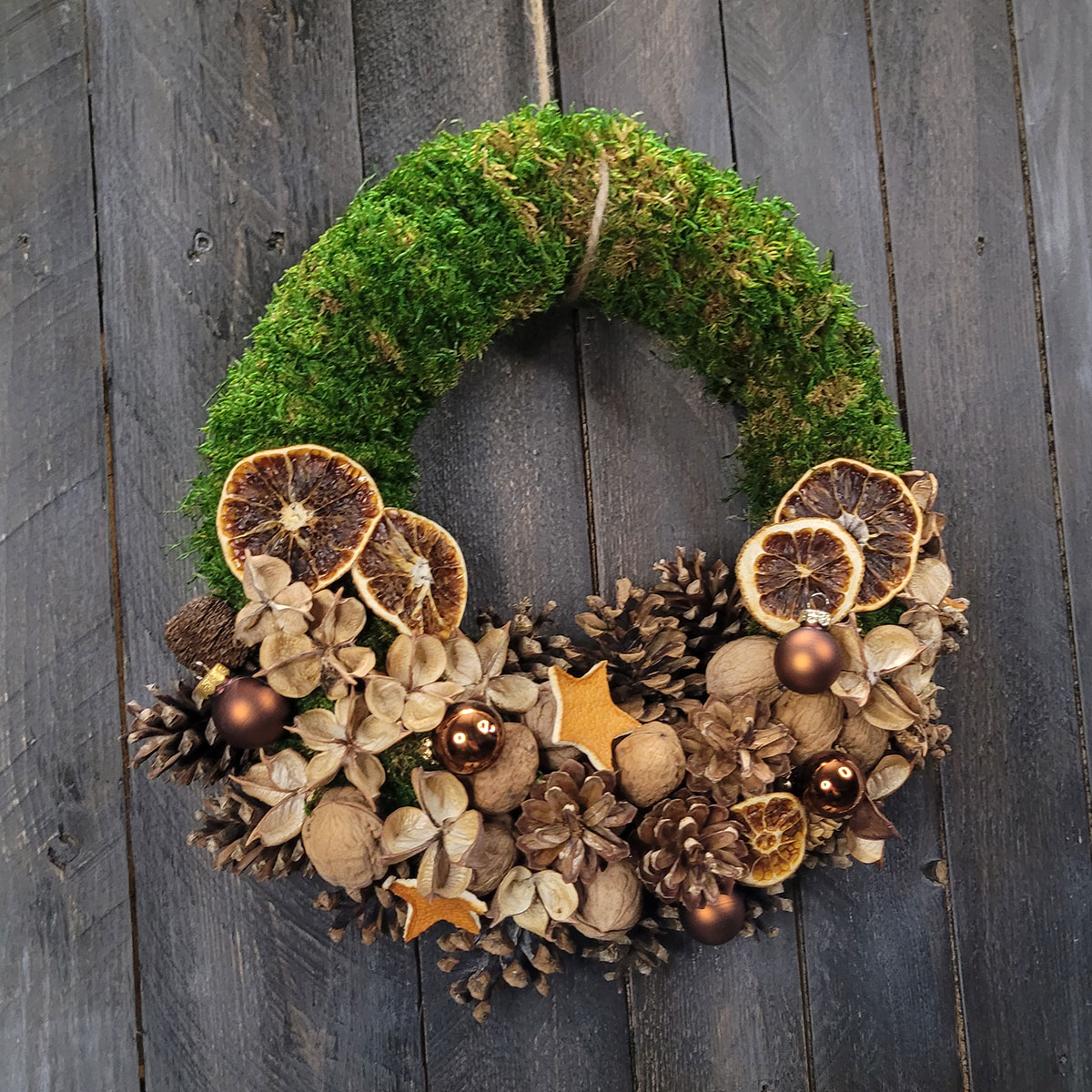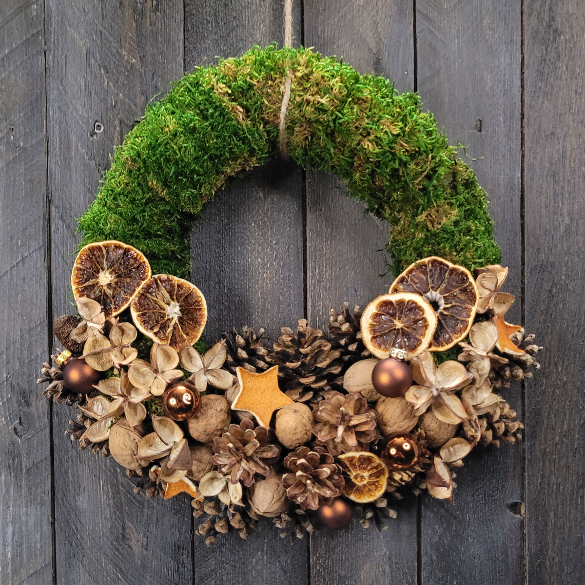 Bożonarodzeniowy wianek z mchu wprowadzi świąteczny klimat do Twojego domu. Ten naturalny, elegancki wianek został stworzony z mchu płaskiego oraz dekoracji takich jak orzechy włoskie, szyszki, gwiazdki z cytrusa, kwiaty bawełny oraz szklane bombki, plastry suszonej pomarańczy. To harmonijne połączenie natury i świątecznej magii.