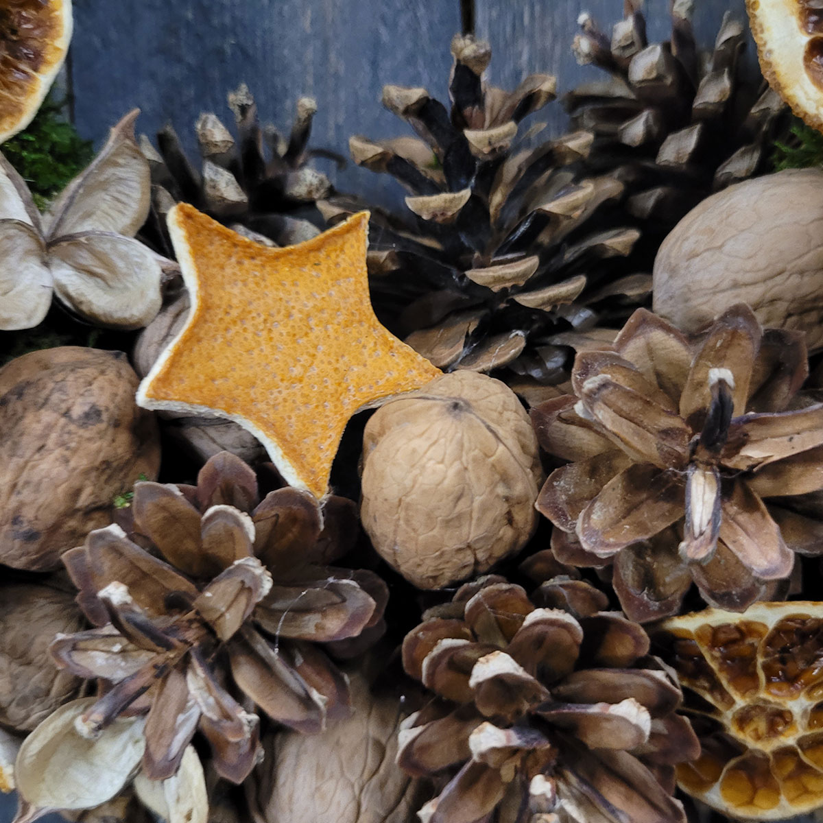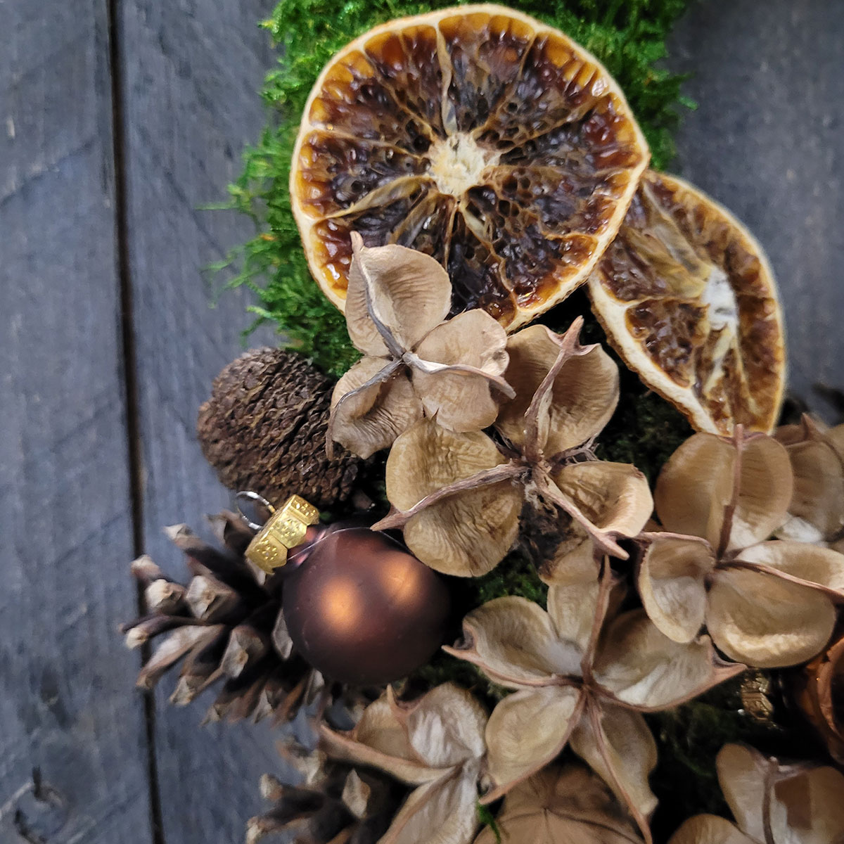 - Naturalne materiały: Wyjątkowa dekoracja z mchu, orzechów, szyszek i aromatycznych plastrów suszonej pomarańczy.