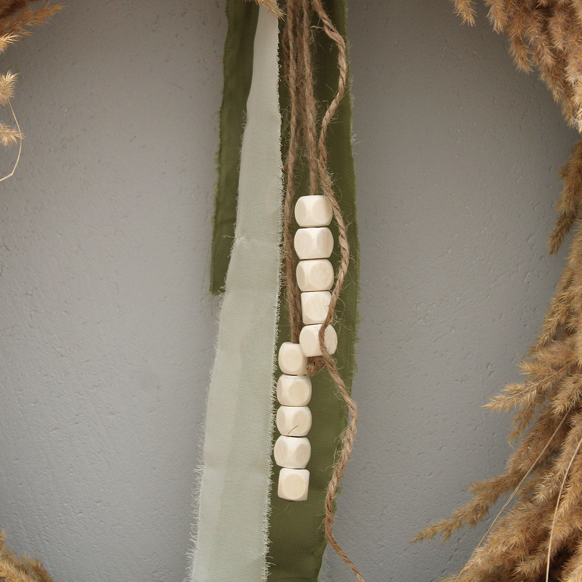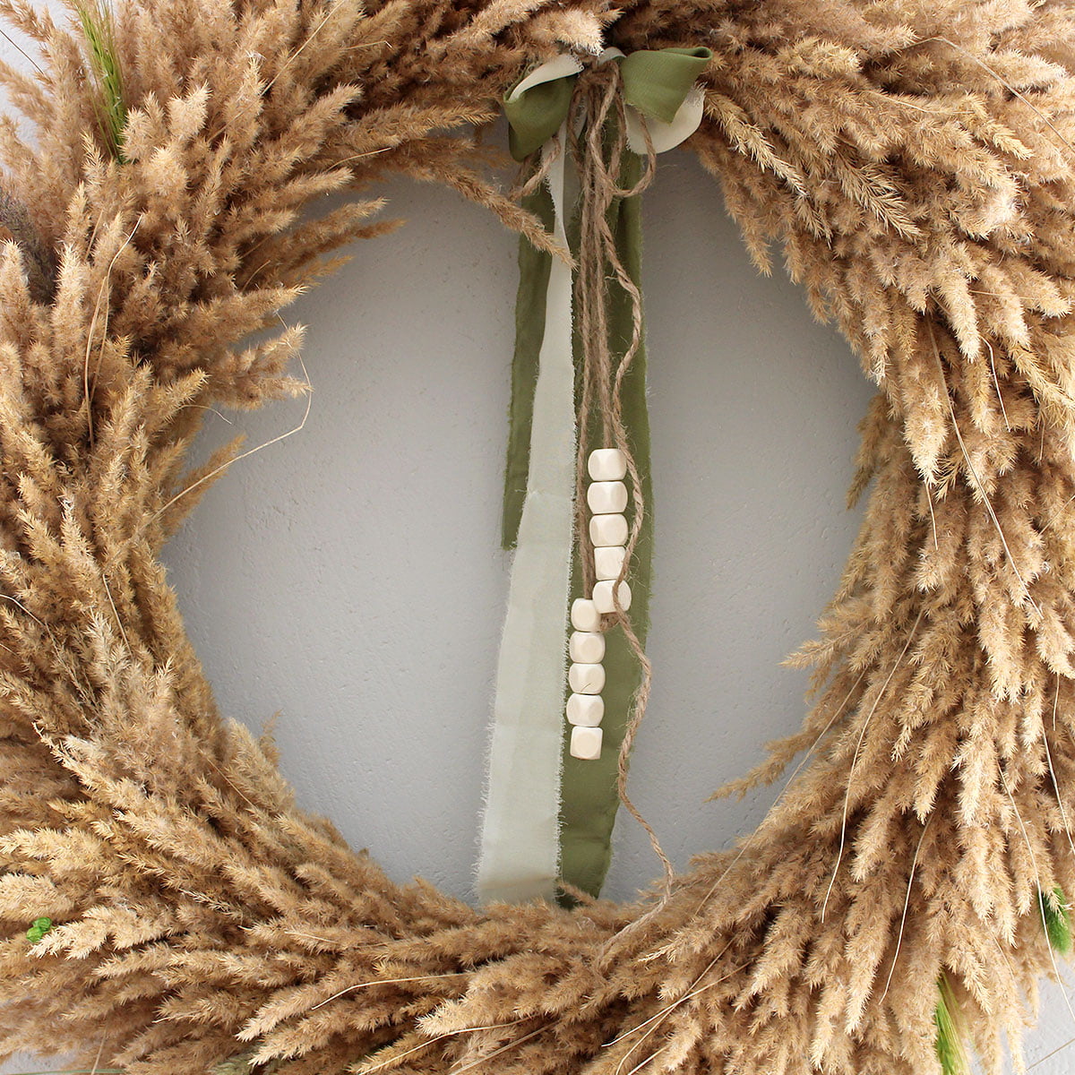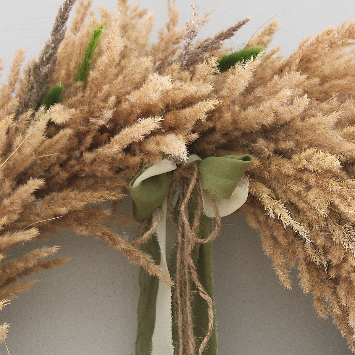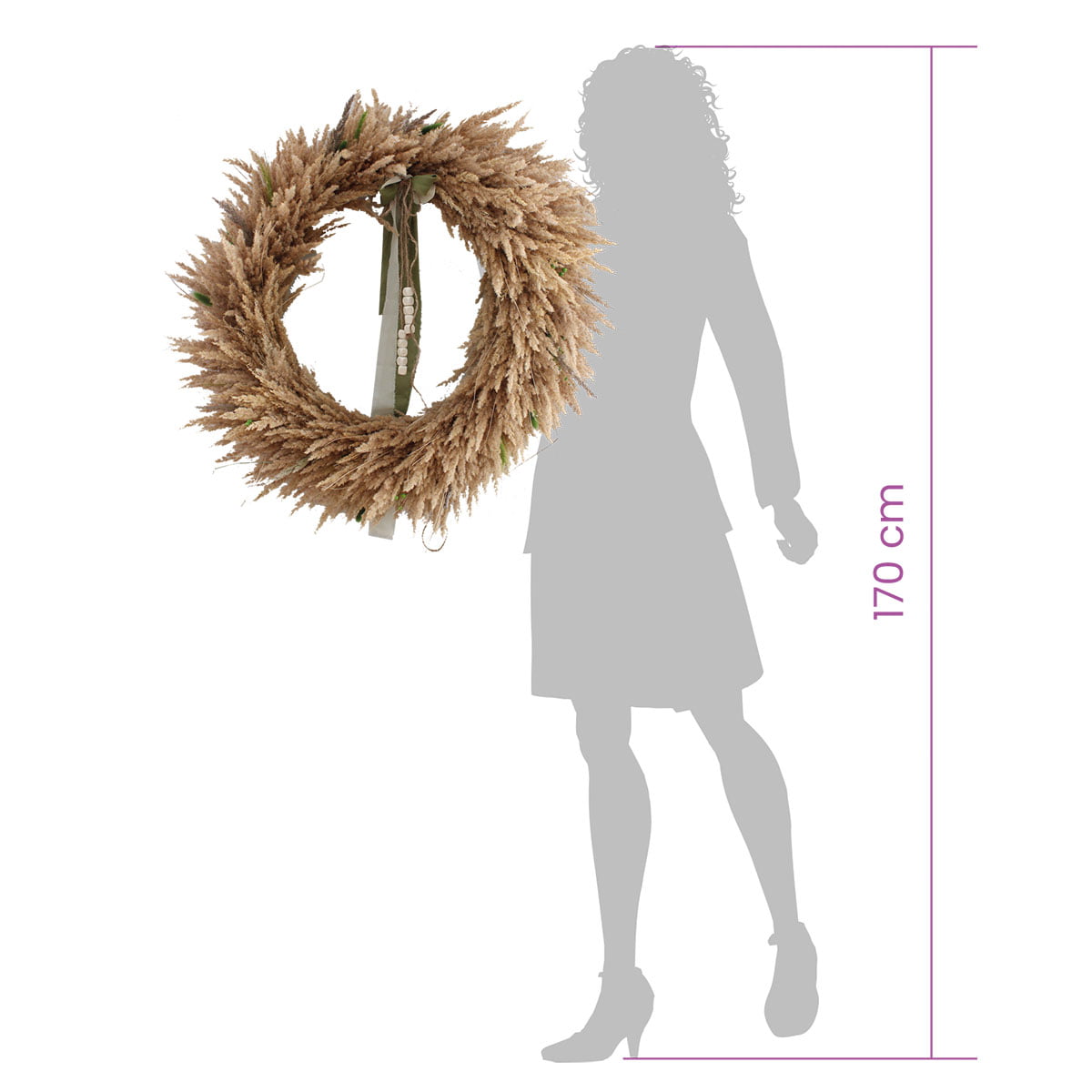 Duży wianek w stylu boho, o średnicy ok 70 cm (od gałązki do gałązki). Wykonany z naturalnych, suszonych traw, lnu, dmuszka i pszenżyta. Delikatności nadaje szyfonowa kokarda w zielono – beżowym kolorze oraz zawieszka z drewnianych elementów. Znakomicie odnajdzie się w nowoczesnej przestrzeni, kamienicznych, bardziej klasycznych wnętrzach lub eklektycznych pomieszczeniach. Idealny do domu, świetna dekoracja kawiarni, restauracji, biura itp.