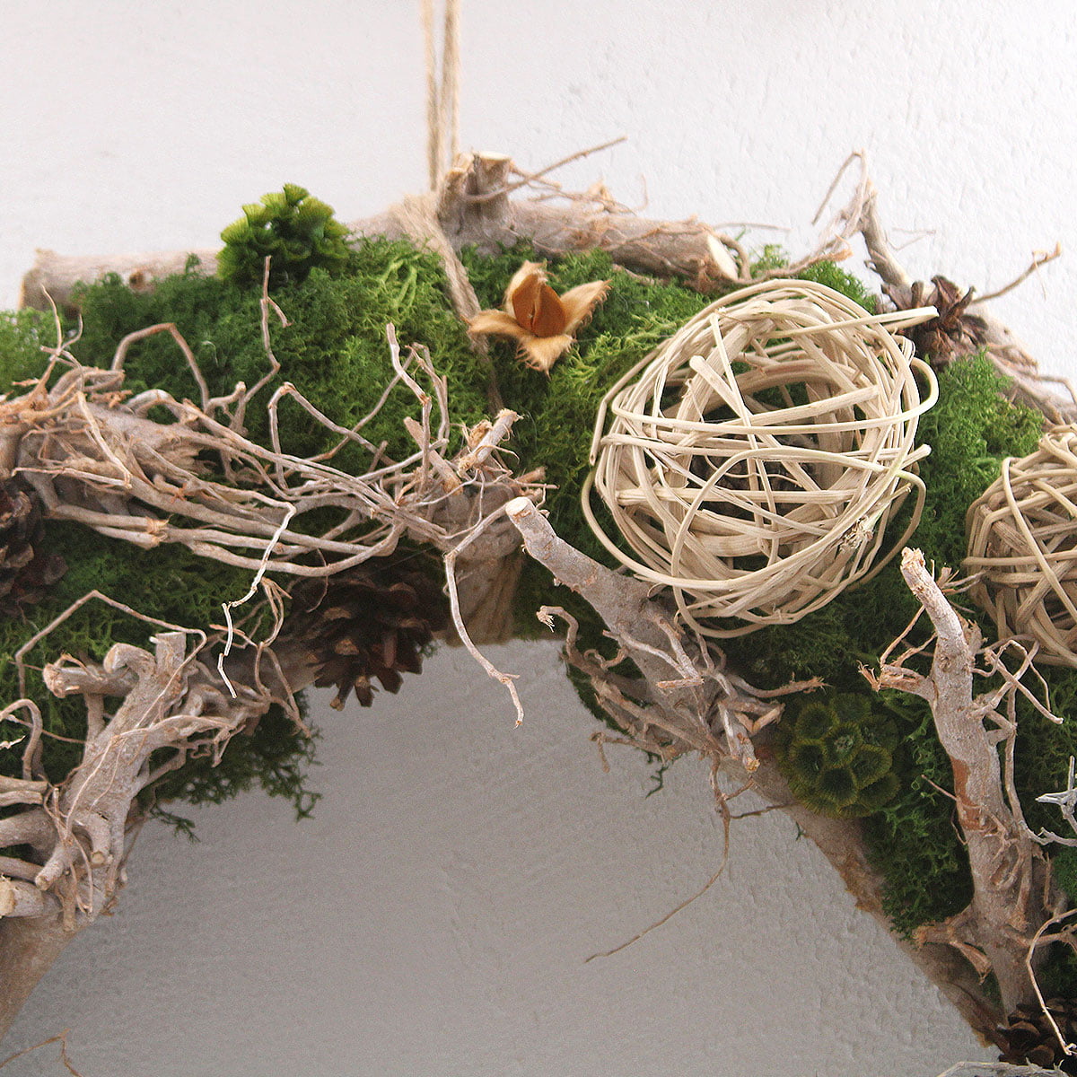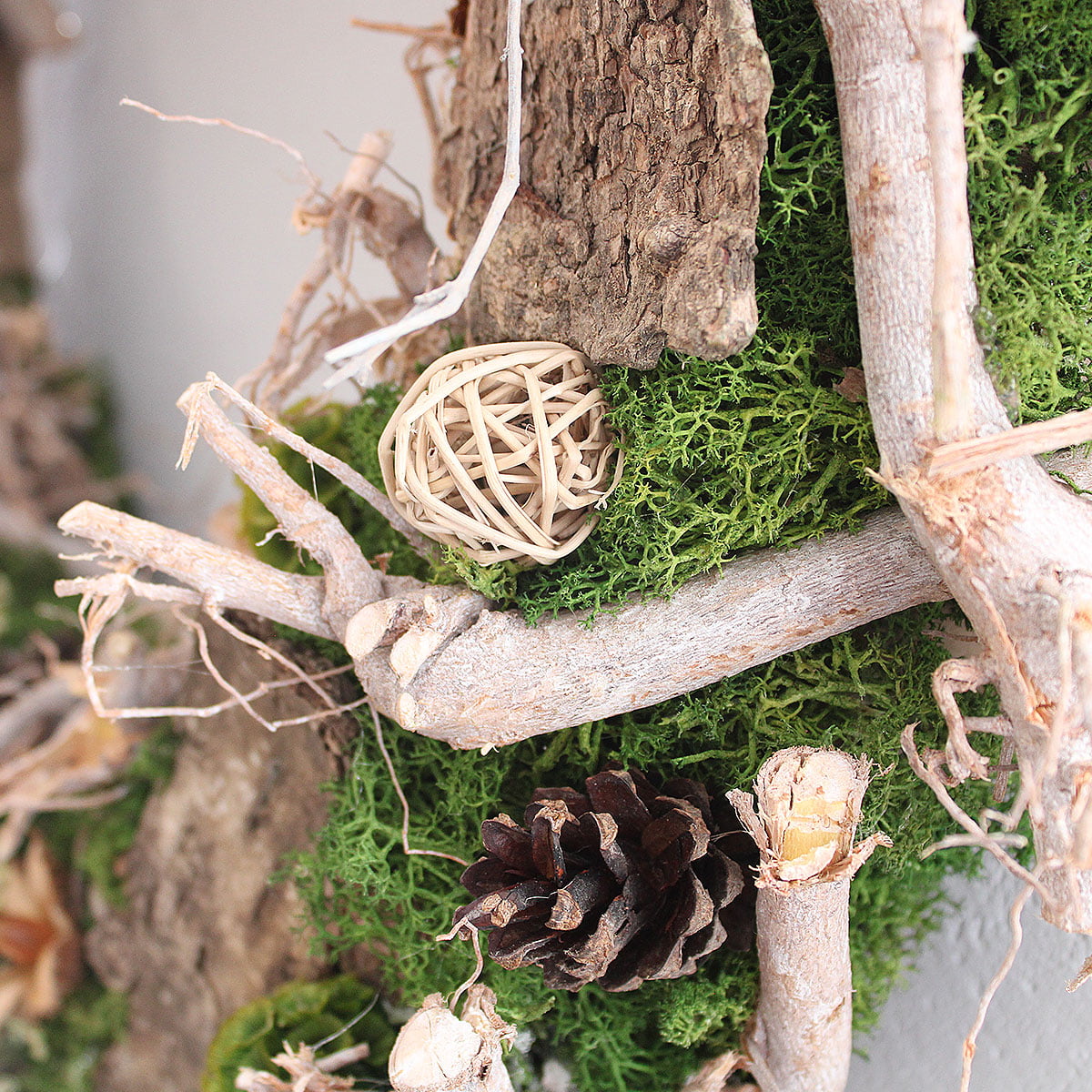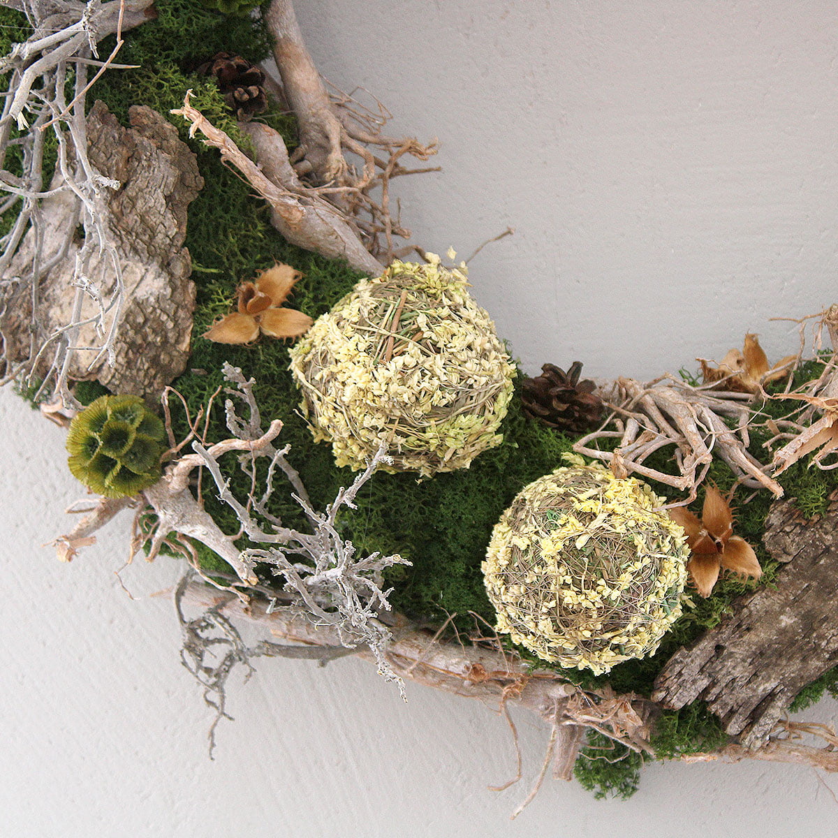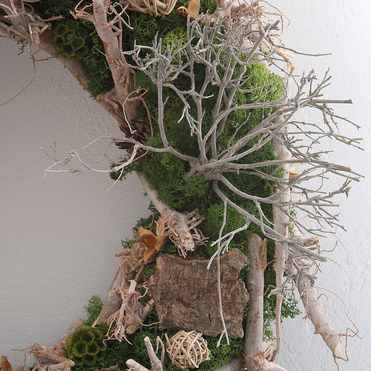Duży wianek z chrobotka o średnicy ok 60 cm. Wianek wykonany z naturalnych suszonych roślin, bielonych gałązek, drobnych szyszek oraz chrobotka reniferowego w kolorze ciemnej zieleni. Leśnym akcentem są kawałki naturalnej kory drzew. Wianek pięknie prezentuje się na drzwiach, ścianie, lustrze czy stole.