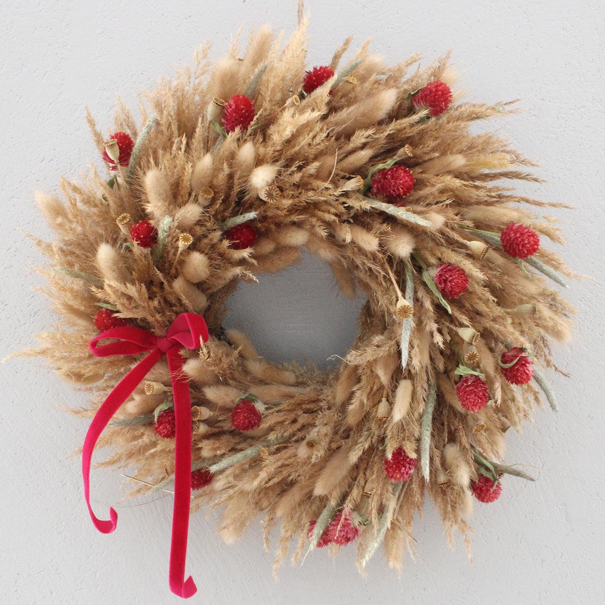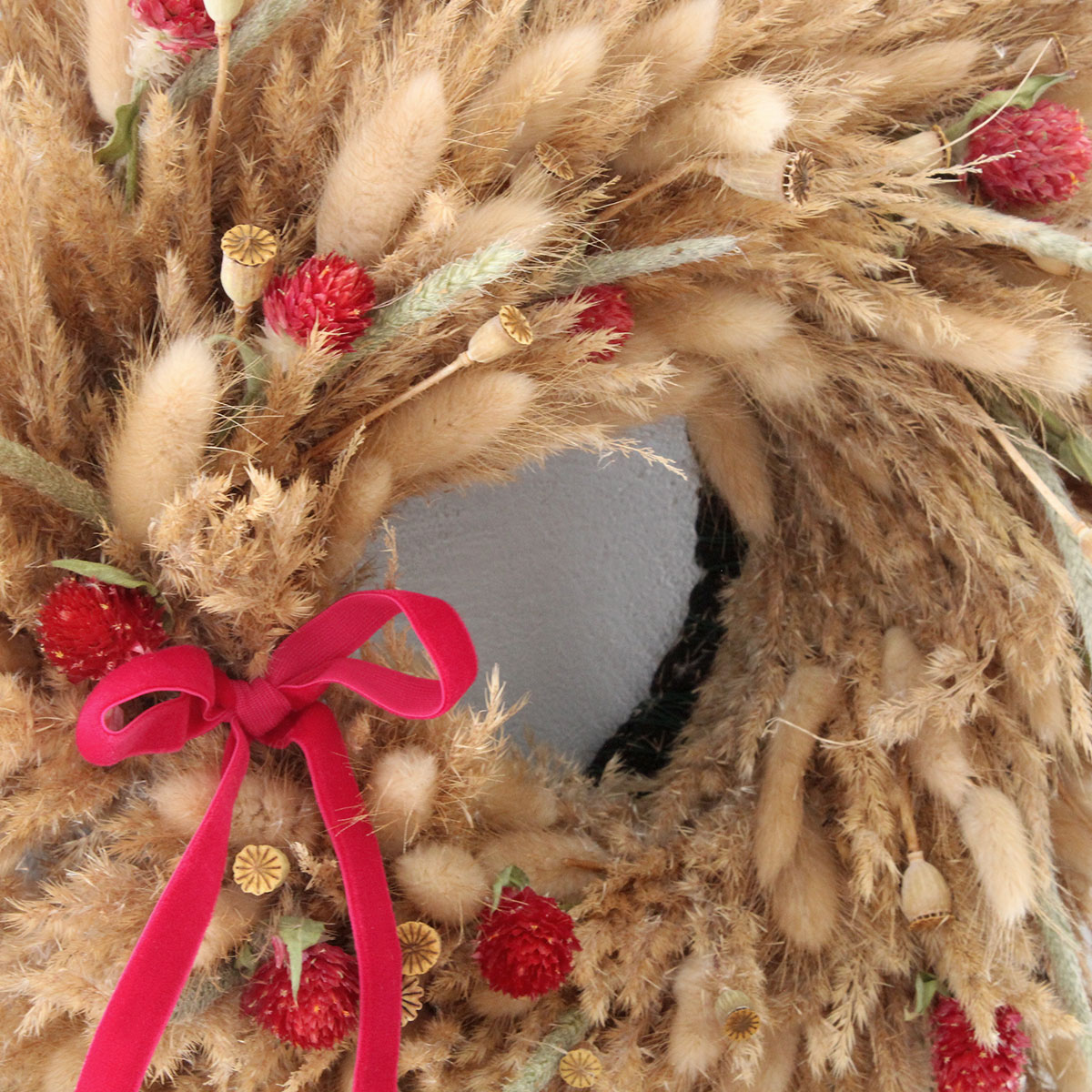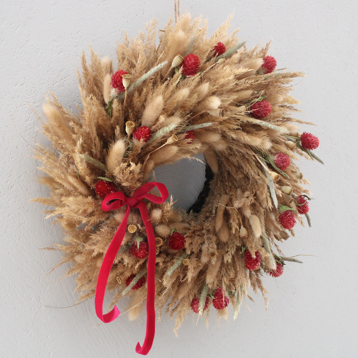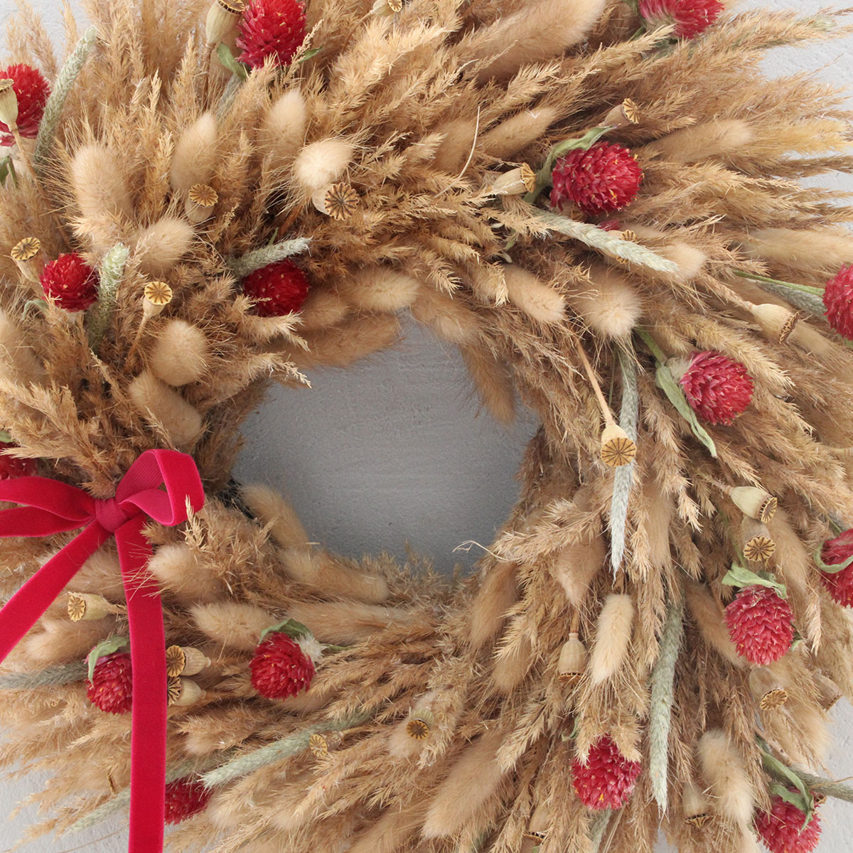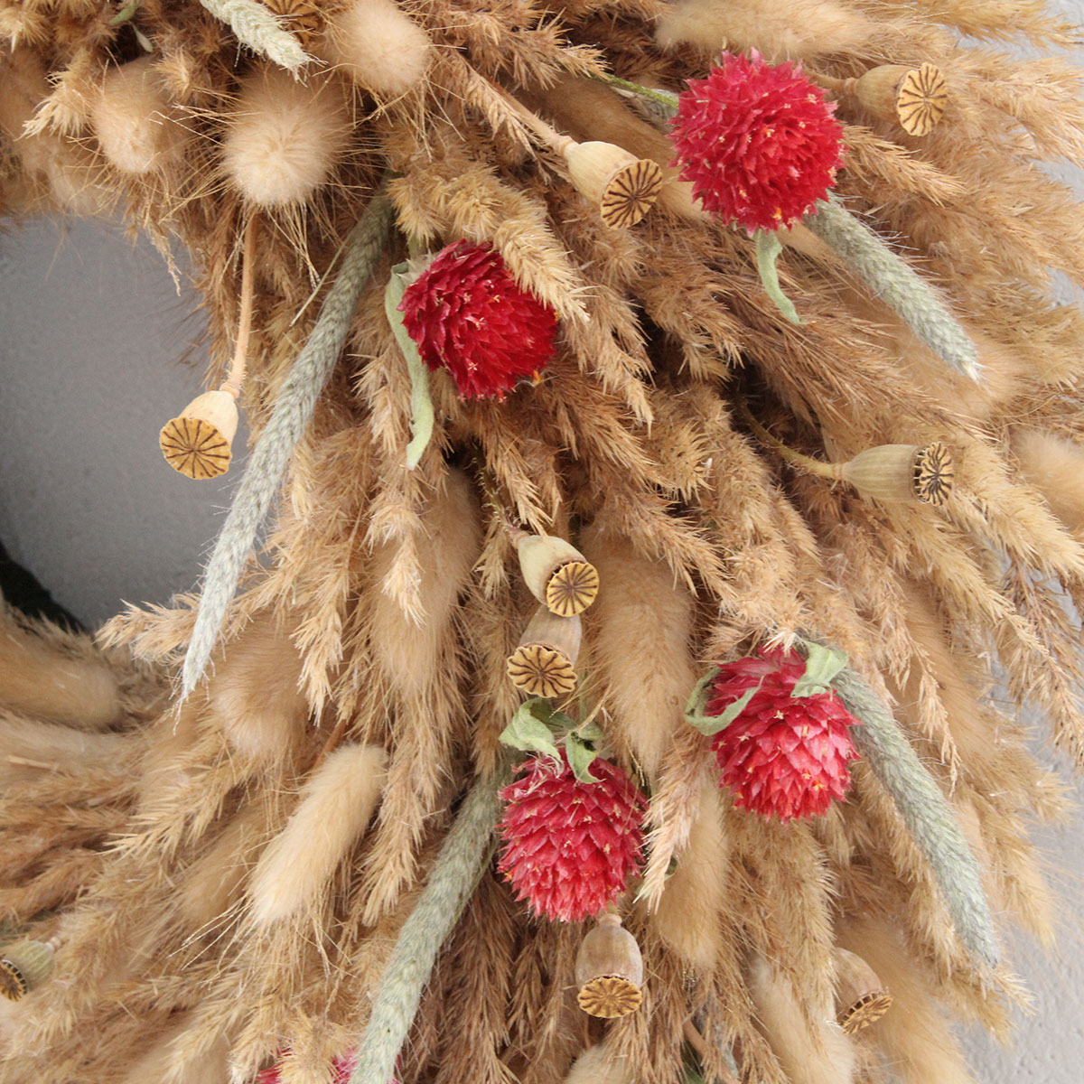 Tego typu ozdoba pięknie prezentuje się na zadaszonych drzwiach wejściowych, witając domowników i gości w jesiennym klimacie. Możesz go powiesić także na ścianie w salonie, jadalni czy kuchni, aby podkreślić naturalny styl wnętrza. Jesienny wianek z traw i makówek doskonale wpisuje się w aranżacje w stylu boho, rustykalnym czy klasycznym.