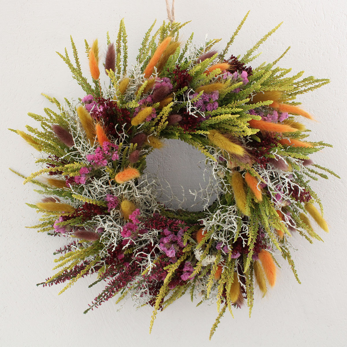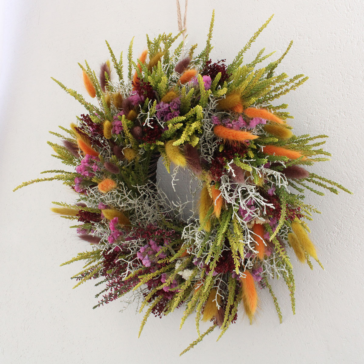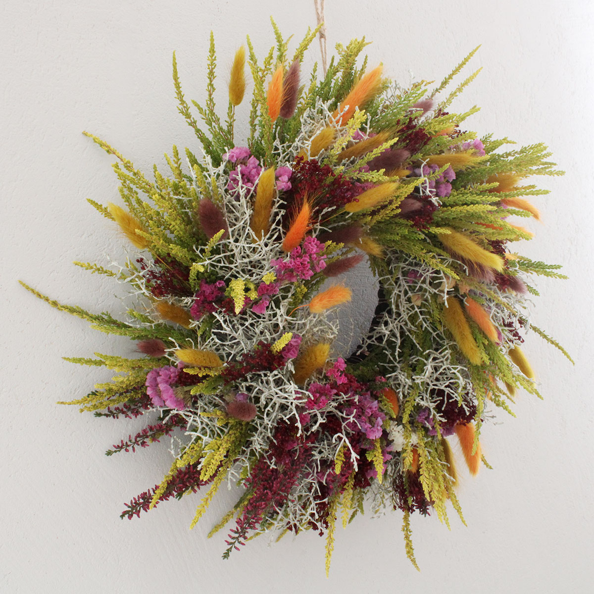 Każdy wianek wykonuję ręcznie, z dużą dbałością o szczegóły. Dzięki temu każdy egzemplarz jest niepowtarzalny, a naturalne rośliny nadają mu indywidualny charakter. Wianek nie wymaga pielęgnacji, co czyni go wygodną i trwałą dekoracją. Wystarczy znaleźć dla niego odpowiednie miejsce, aby przez długi czas cieszył oczy barwami natury i wprowadzał do domu wyjątkowy nastrój.