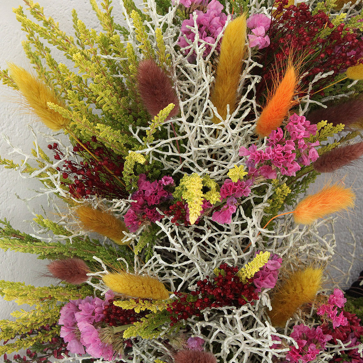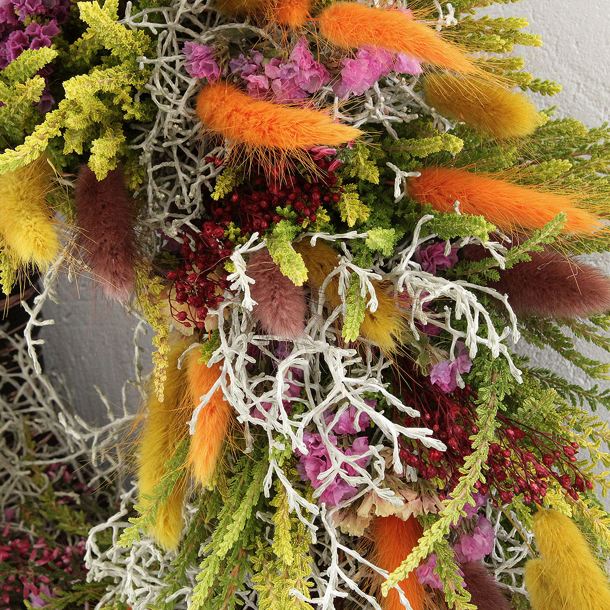 Każdy element kompozycji ma swoje znaczenie. Wrzosy o seledynowym odcieniu tworzą miękkie tło, które podkreśla intensywne barwy pozostałych roślin. Dmuszek w kolorze pomarańczowym, ochrowym i brązowym dodaje ciepła i energii. Różowy zatrwian wprowadza lekkość, a bordowy broom bloom nadaje całości głębi i wyrafinowania. Jasny drutowiec przełamuje kompozycję i rozświetla ją, dzięki czemu wianek prezentuje się świeżo i przestrzennie. Razem tworzą harmonijną całość, która doskonale oddaje klimat złotej jesieni.