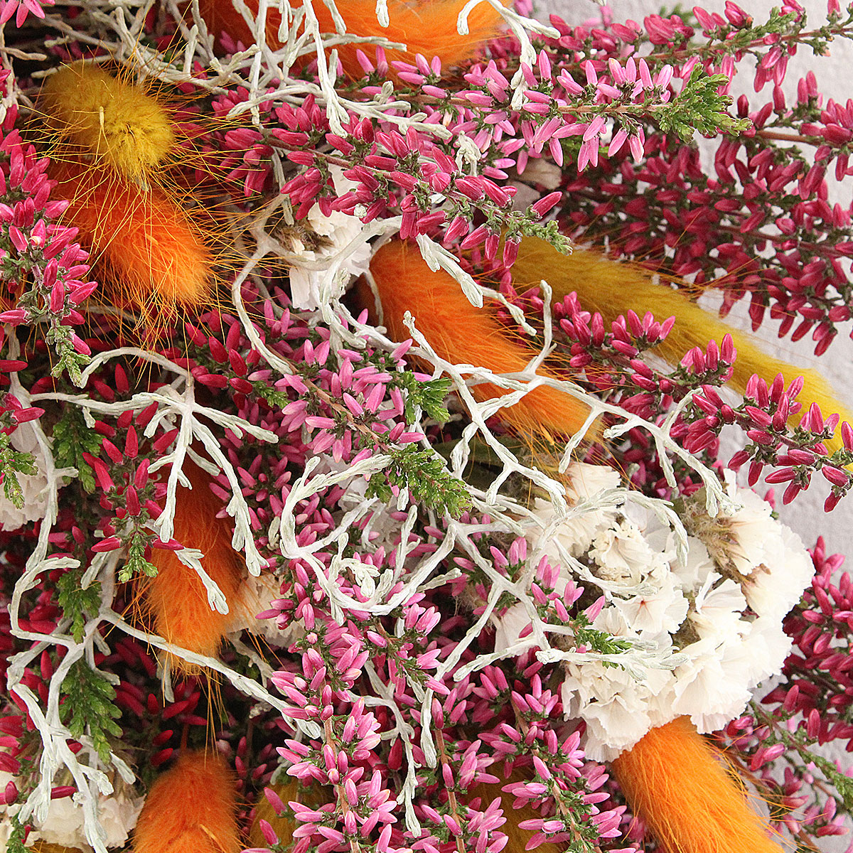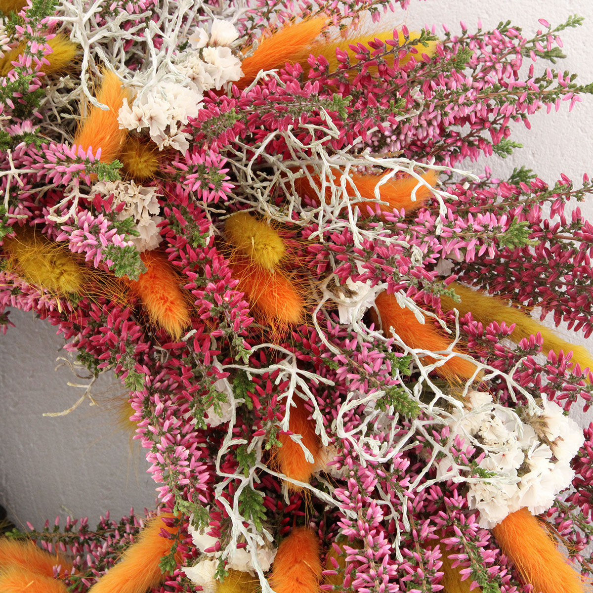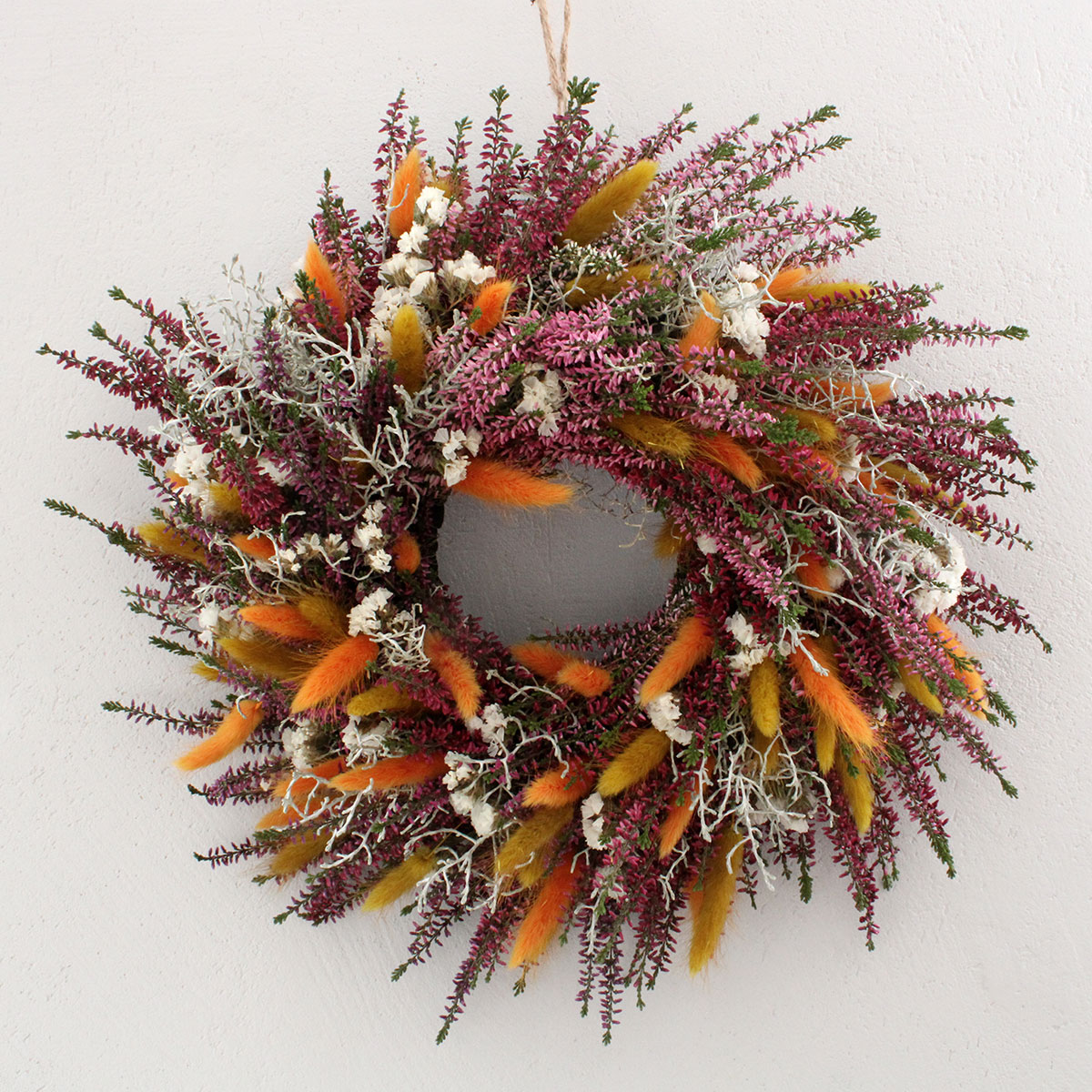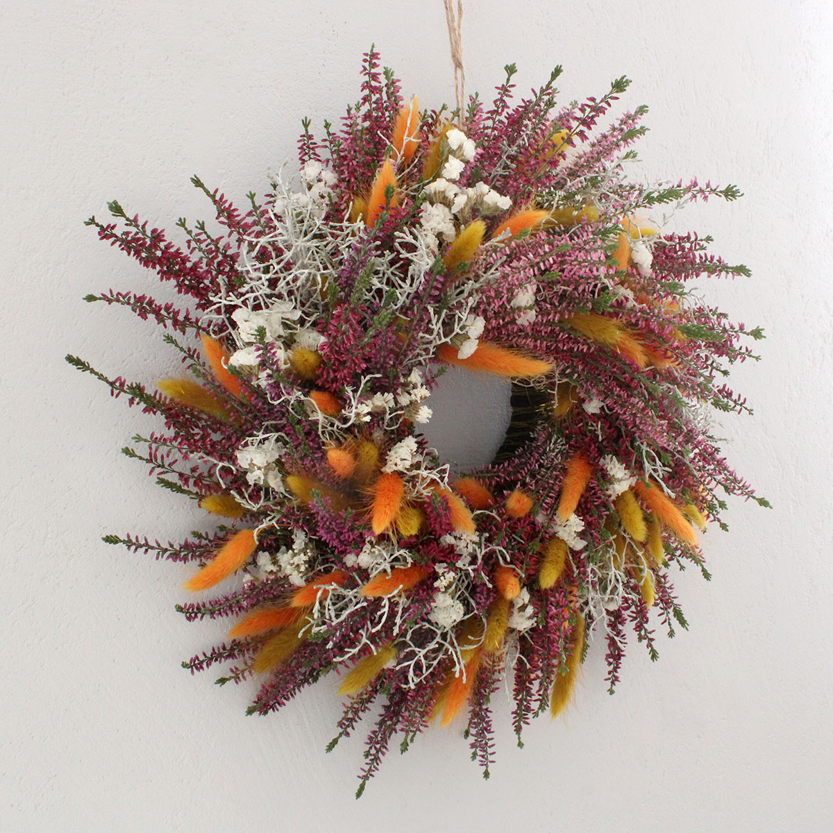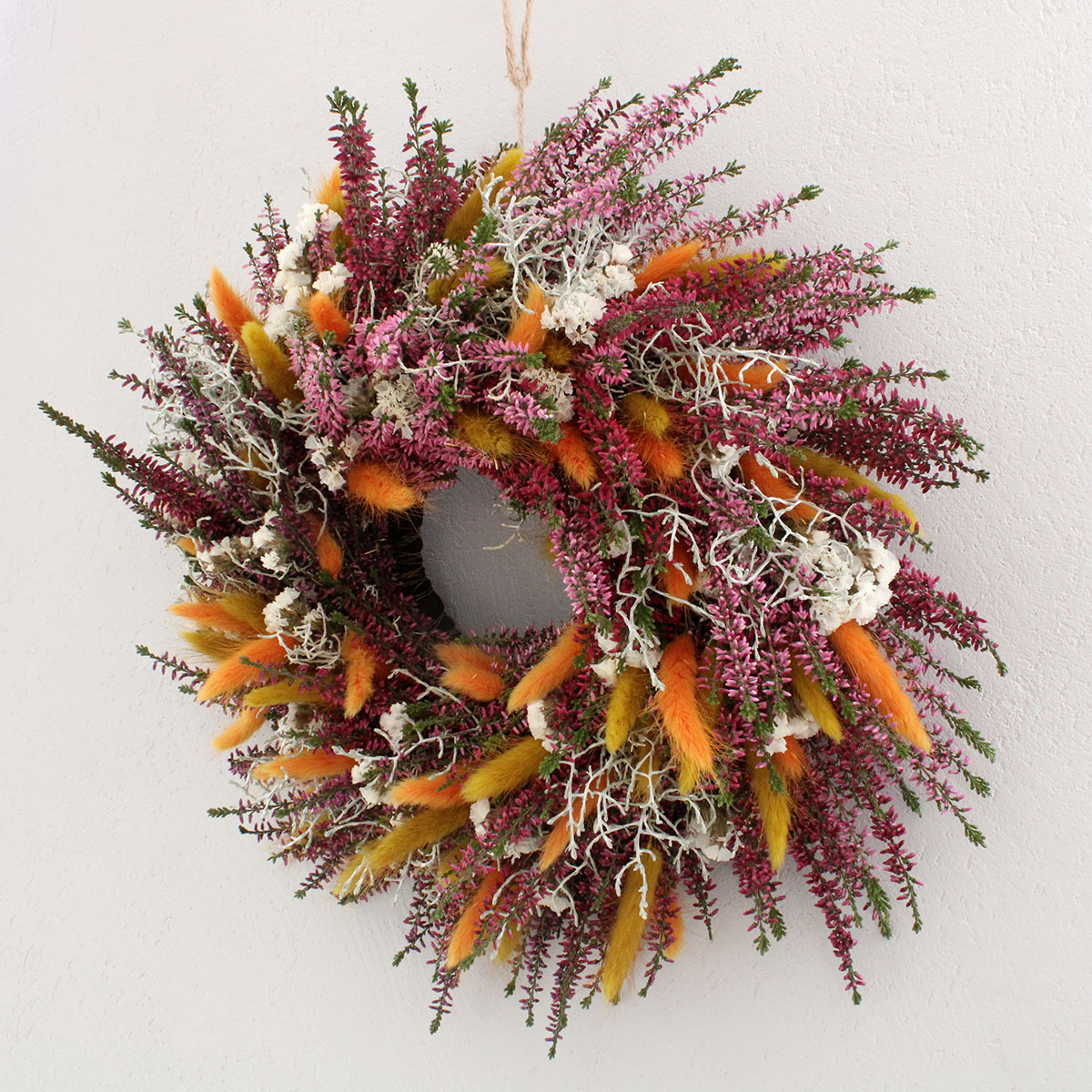 W kompozycji połączono świeże wrzosy, dmuszek w kolorze pomarańczowym i ochry, biały zatrwian oraz srebrzysty drutowiec. Każdy z tych elementów dobrano z myślą o harmonii i naturalnym pięknie. Fioletowe wrzosy stanowią główny motyw dekoracji, dmuszek dodaje energii i ciepła, a biały zatrwian rozświetla całość. Drutowiec wprowadza lekkość i subtelny kontrast. Takie zestawienie barw sprawia, że wianek wygląda naturalnie i pasuje do wielu aranżacji – od rustykalnych po nowoczesne.
