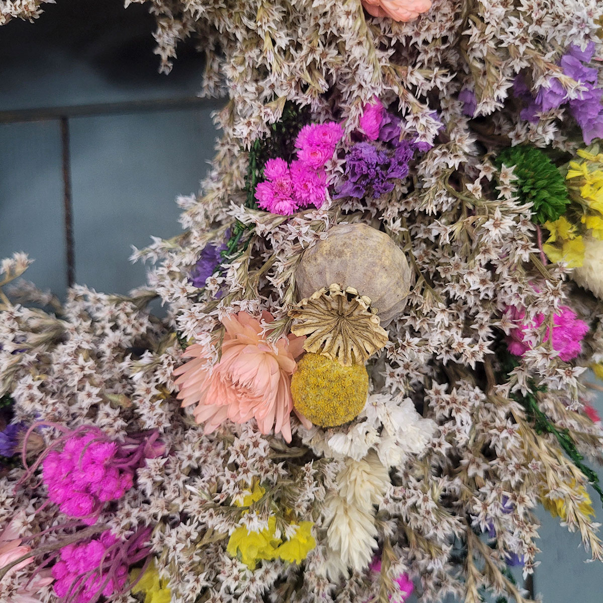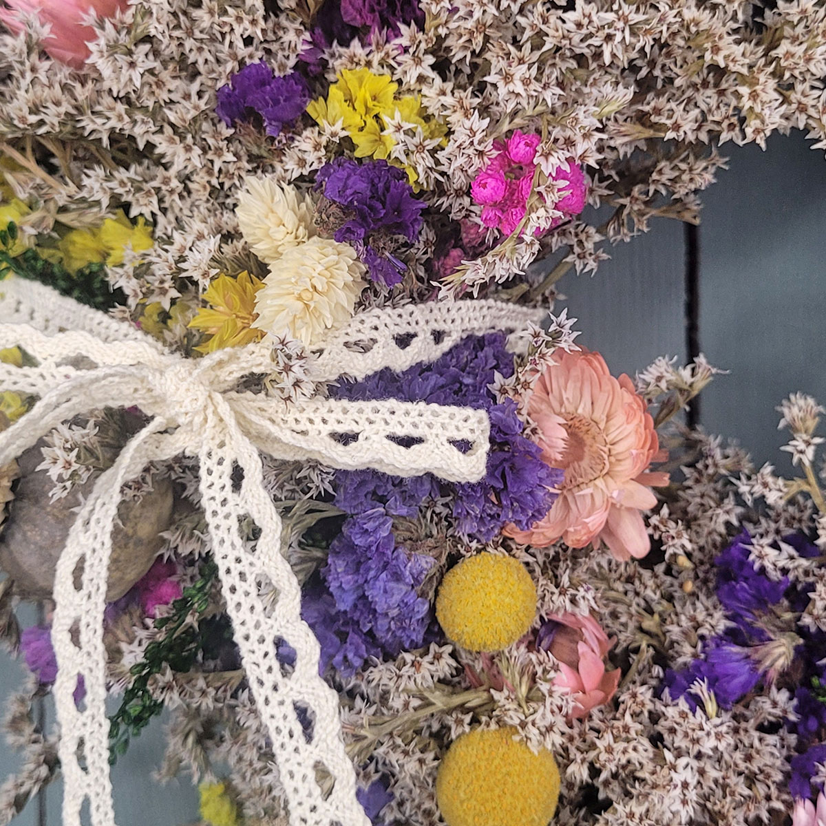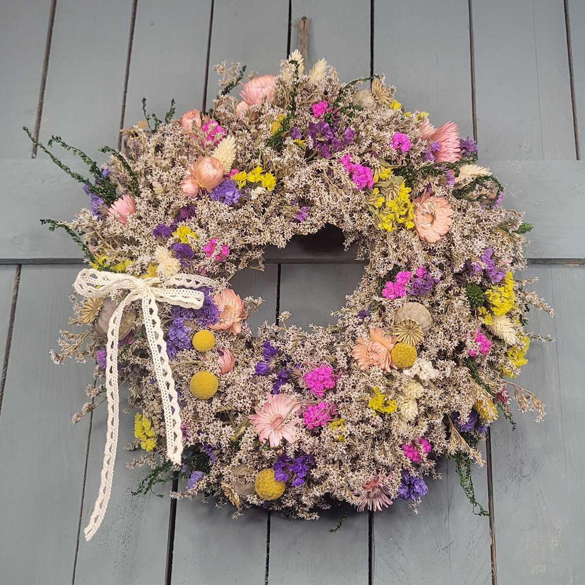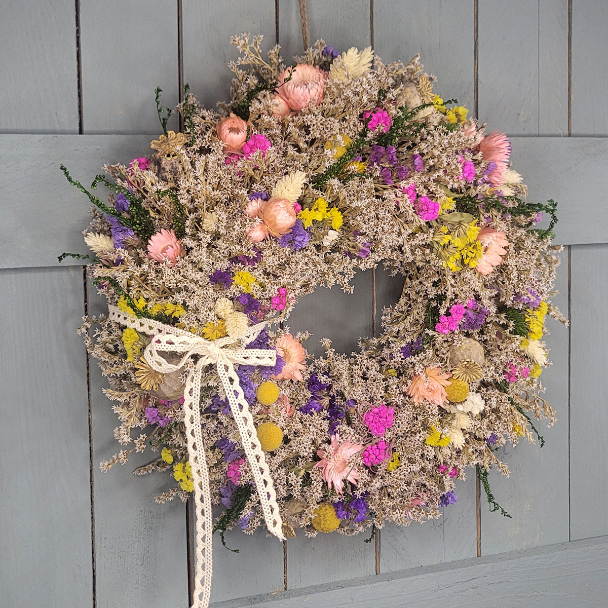 Ten model możesz eksponować nie tylko wiosną. Dzięki uniwersalnej kolorystyce wianek z suszonych kwiatów na drzwi sprawdzi się przez cały rok. Wprowadzi do wnętrza przytulność oraz naturalne ciepło niezależnie od sezonu.