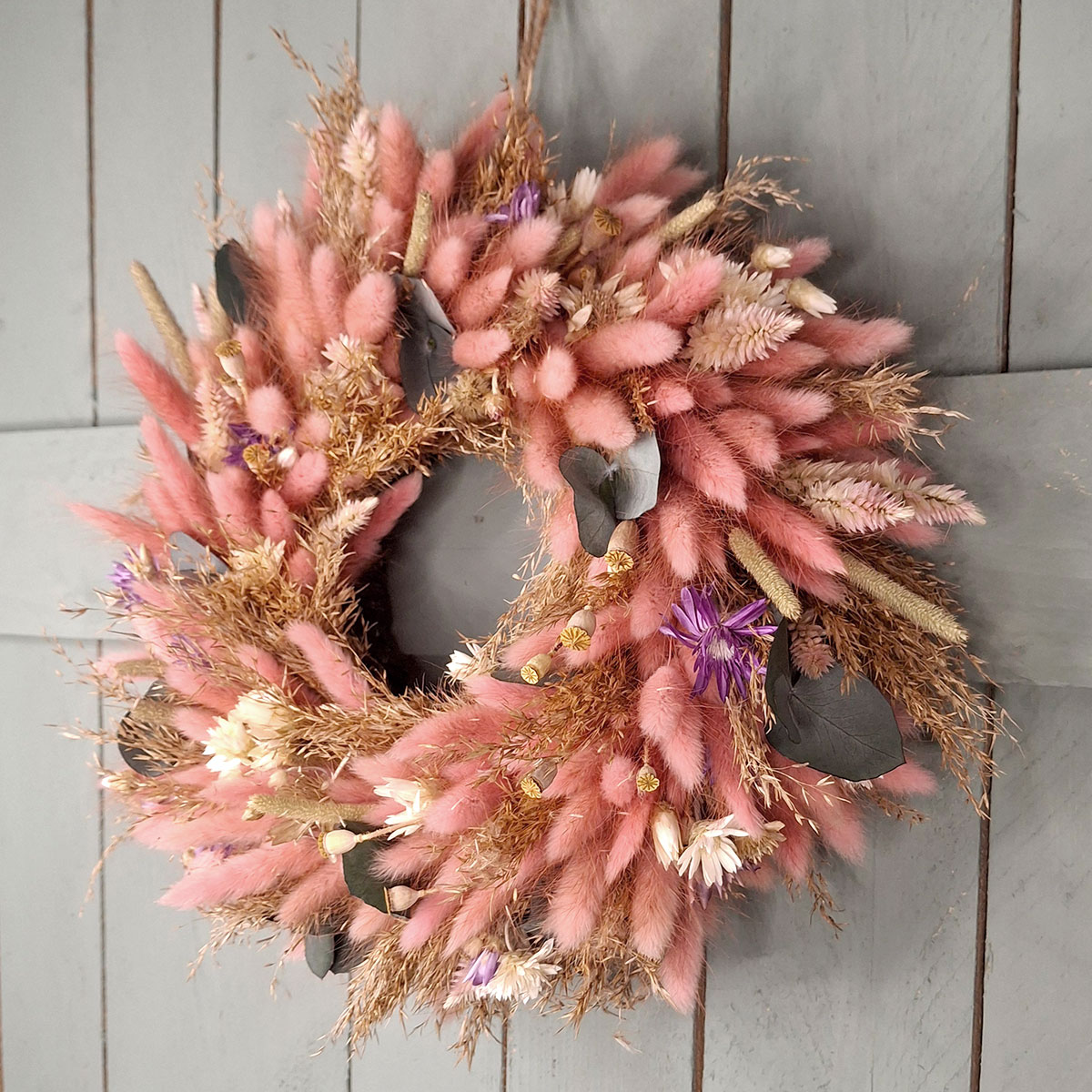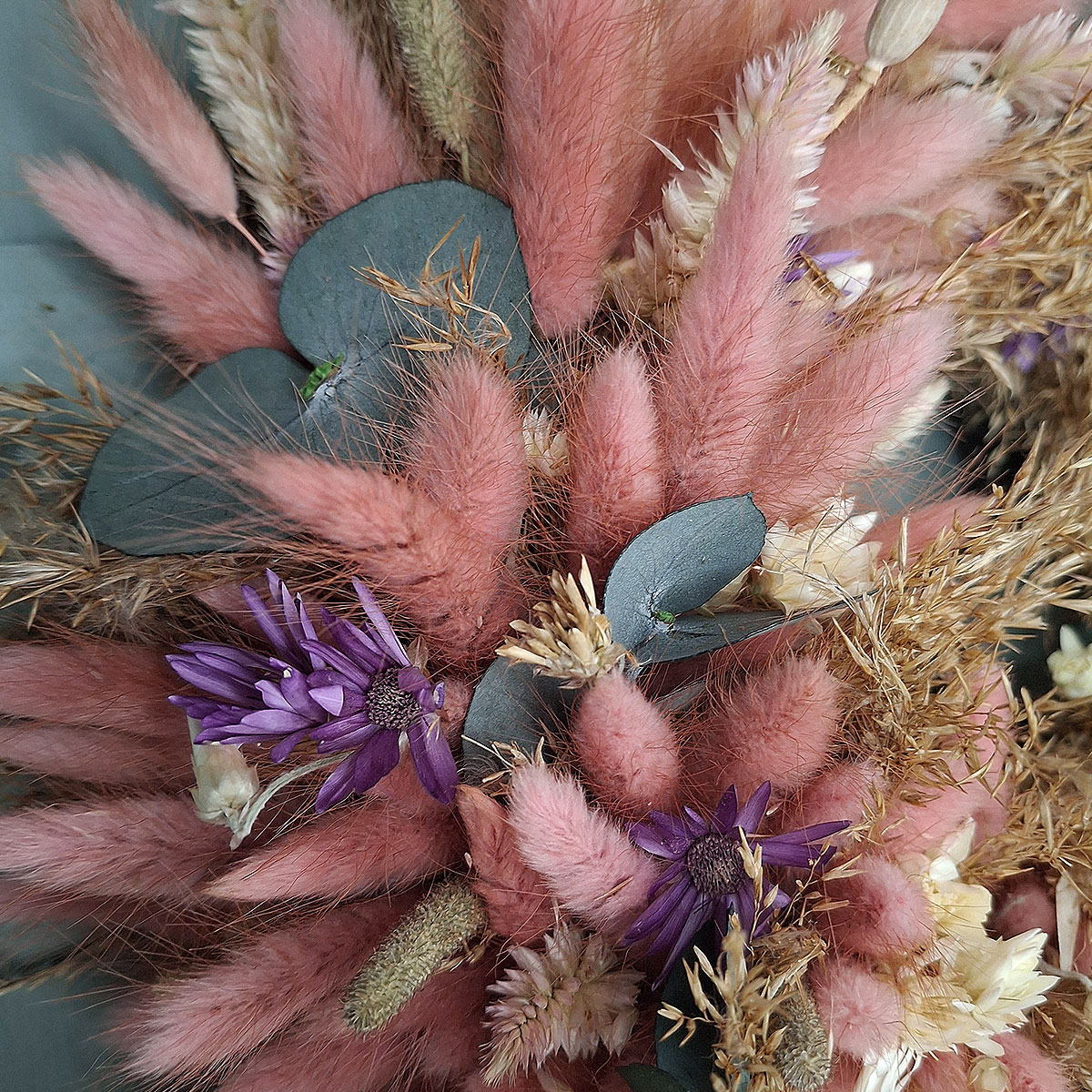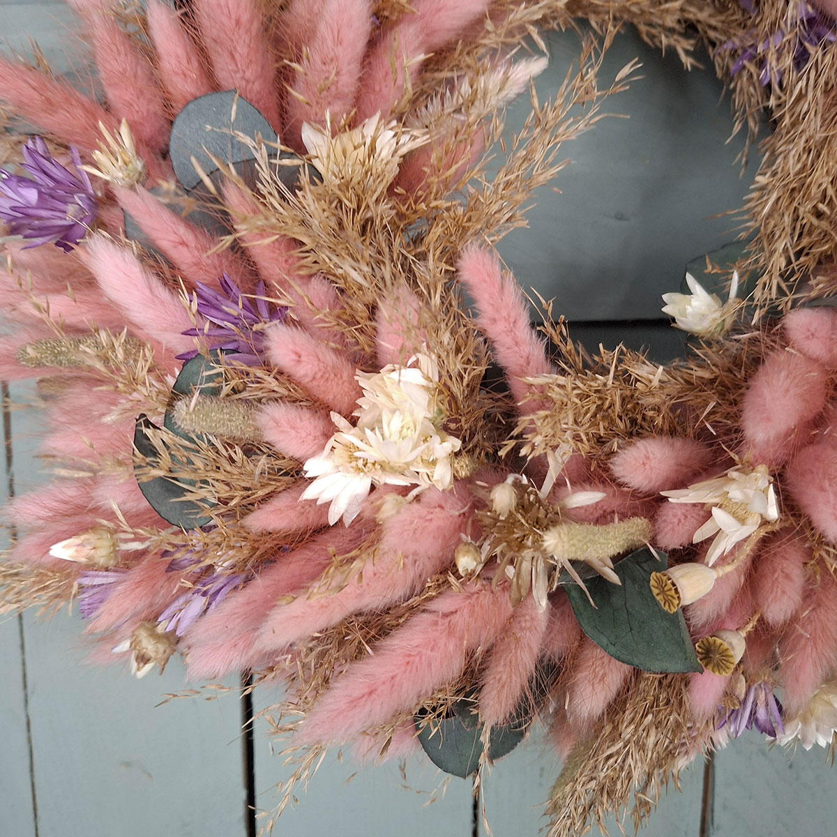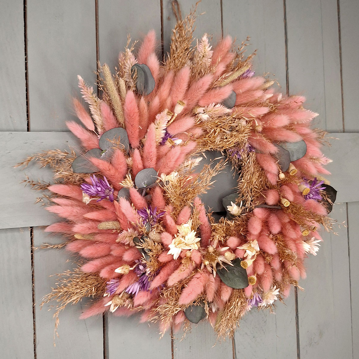 Do jego wykonania wykorzystano dmuszek w odcieniu pastelowego różu, naturalne trawy, dekoracyjny suchokwiat, efektowną celozję, maleńkie makówki oraz eleganckie liście eukaliptusa. Każdy element został dobrany z dbałością o detale, dzięki czemu kompozycja prezentuje się lekko, świeżo i bardzo estetycznie. Pastelowy wianek z dmuszka przyciąga wzrok, ale jednocześnie nie dominuje przestrzeni – idealnie podkreśla charakter wnętrza lub aranżacji.