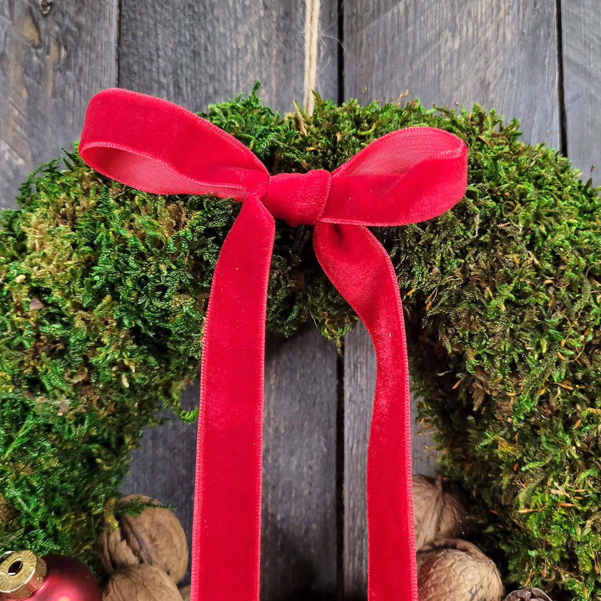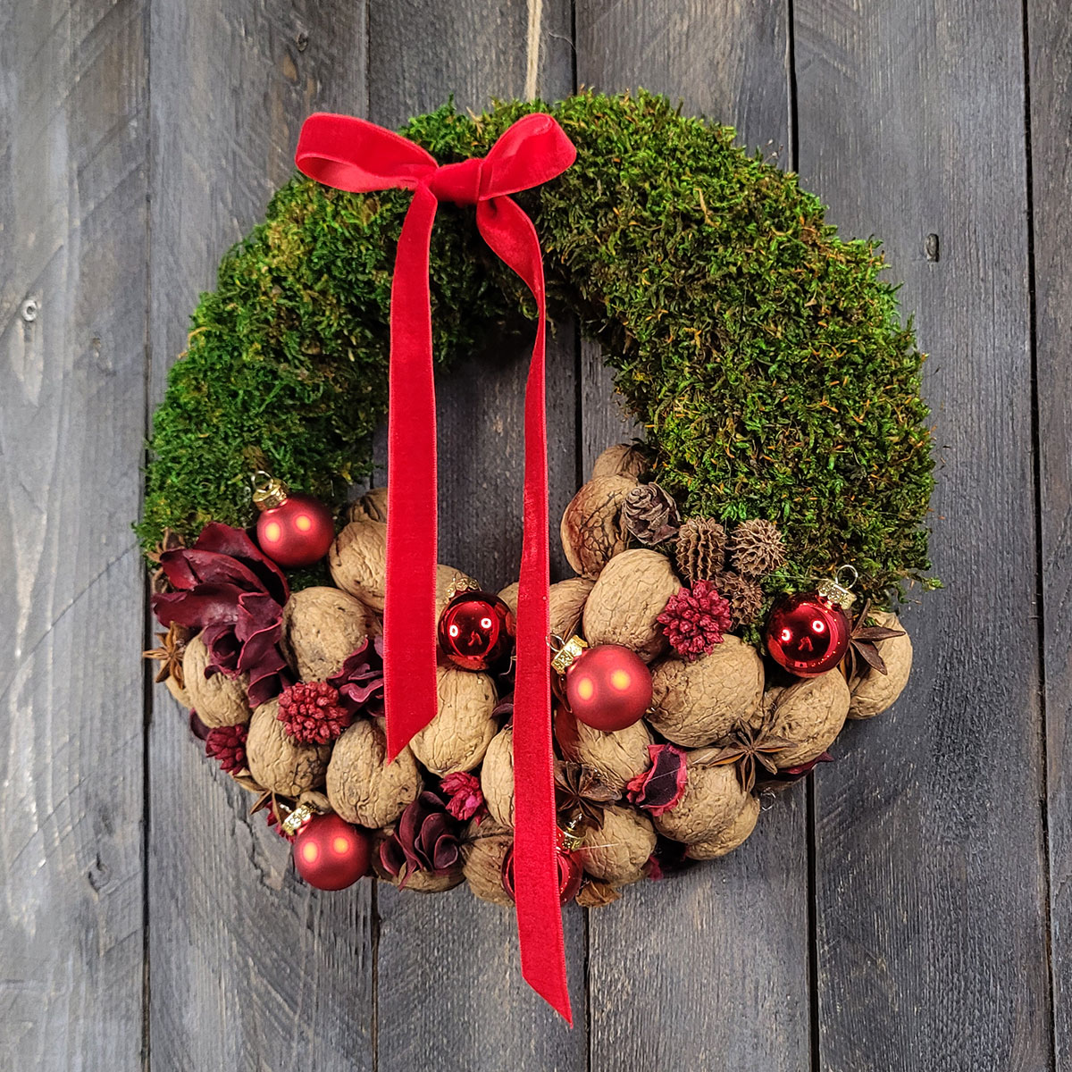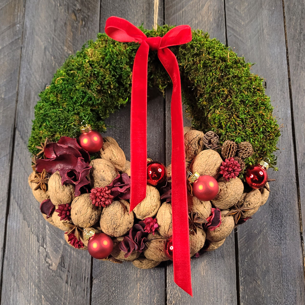 Świąteczny wianek z mchem o średnicy około 27 cm to wyjątkowa dekoracja, która wprowadza do wnętrza naturalne ciepło i świąteczną atmosferę. Wykonano go z mchu płaskiego, orzechów włoskich, owocowego suszu, szyszek oraz małych szklanych bombek. Całość uzupełnia aksamitna kokarda w czerwonym kolorze, która dodaje elegancji i klasy.