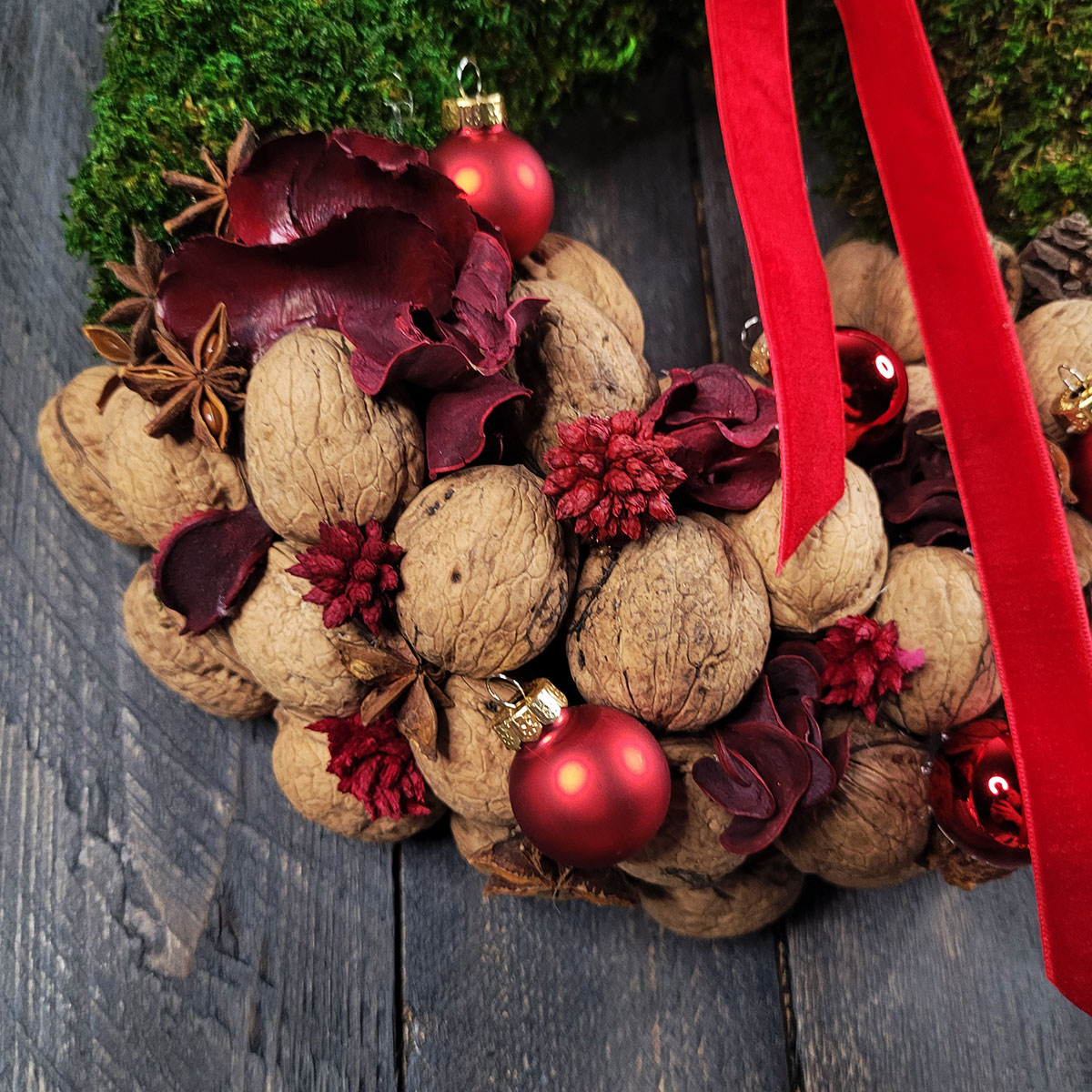 Każdy wianek powstaje ręcznie, dzięki czemu zachowuje indywidualny charakter. Naturalne elementy, takie jak mech, orzechy i susz, nadają jej wyjątkowego uroku. Co więcej, aksamitna kokarda w kolorze czerwonym pięknie kontrastuje z zielenią, tworząc klasyczne świąteczne połączenie.