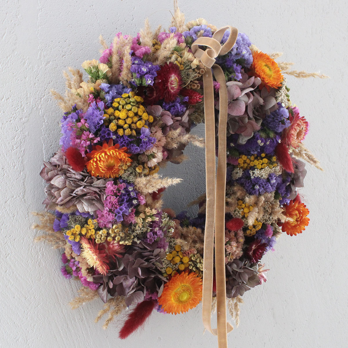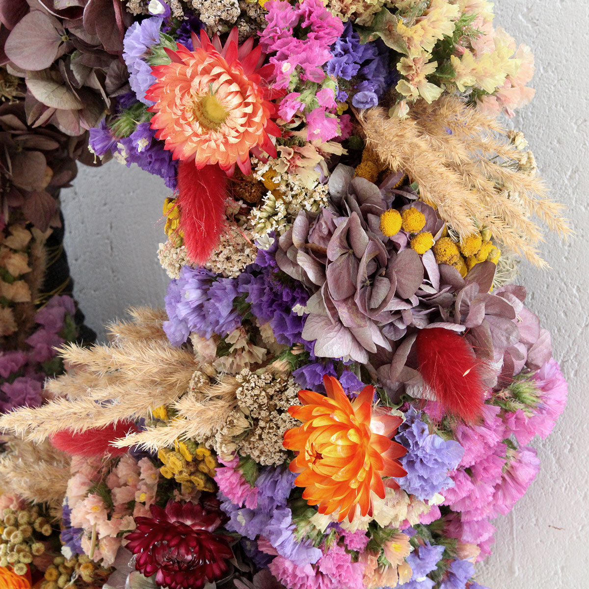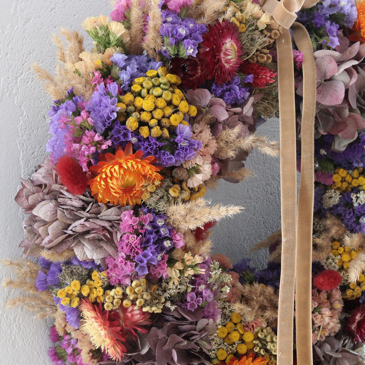 Do stworzenia tego wianka wykorzystano suszone trawy, hortensje, zatrwian w odcieniach fioletowym, różowym i łososiowym, bordowy dmuszek, barwne kocanki, krwawnik, wrotycz oraz dziką marchew. Całość została zwięczona aksamitną kokardką w kolorze beżowym, która nadaje dekoracji subtelnej elegancji i sprawia, że prezentuje się niezwykle efektownie.