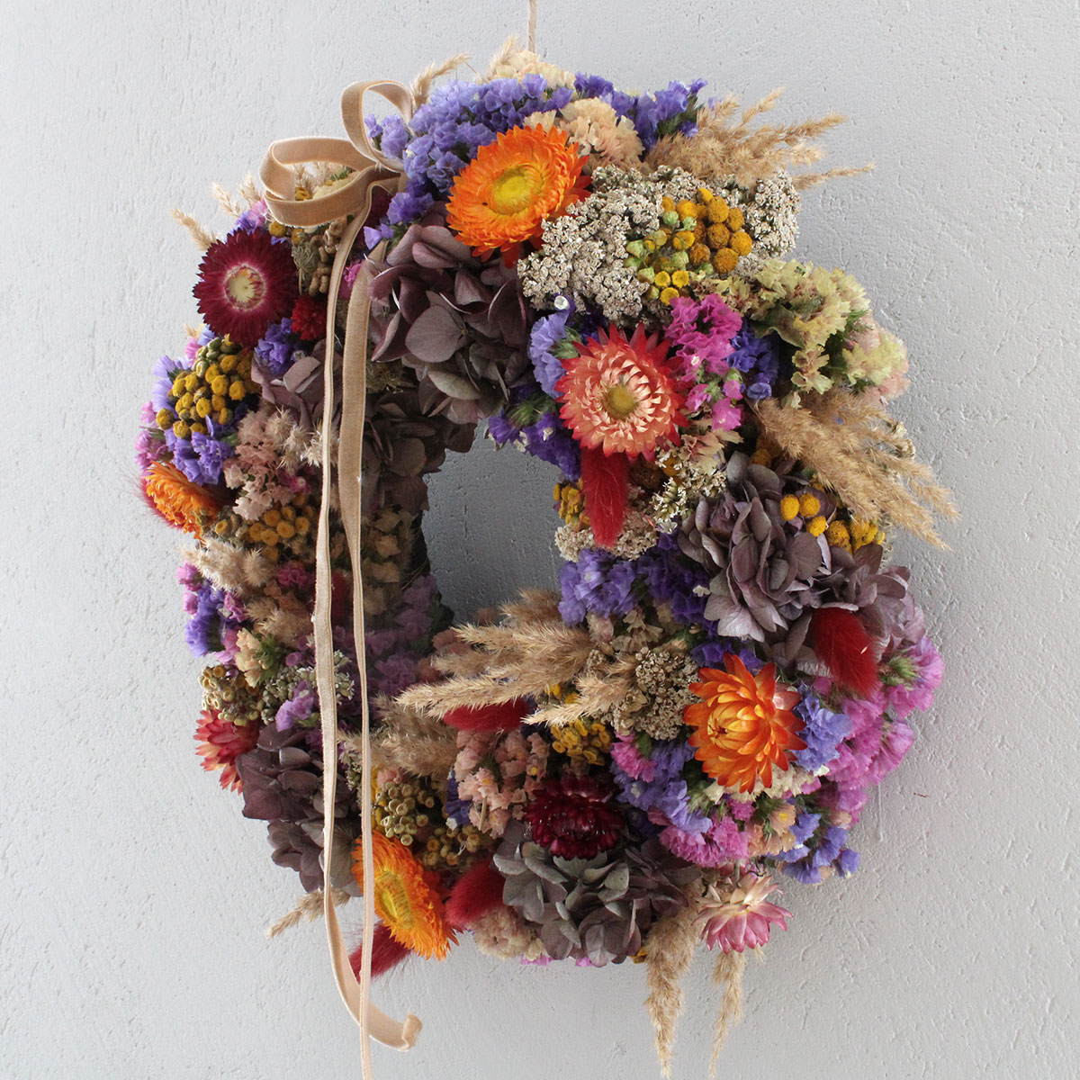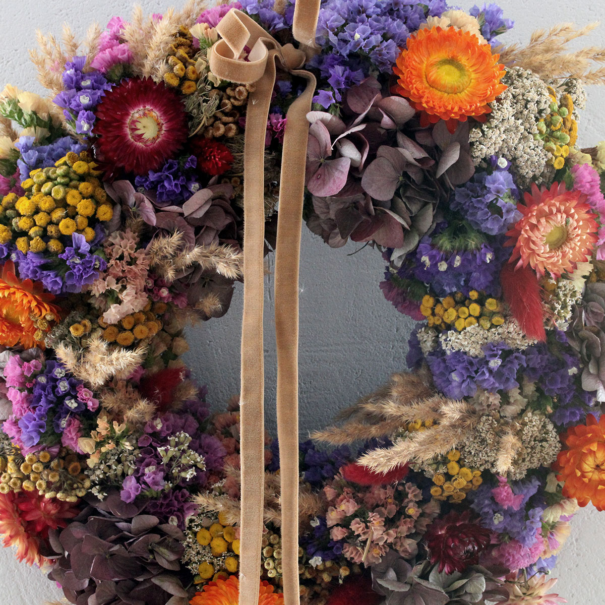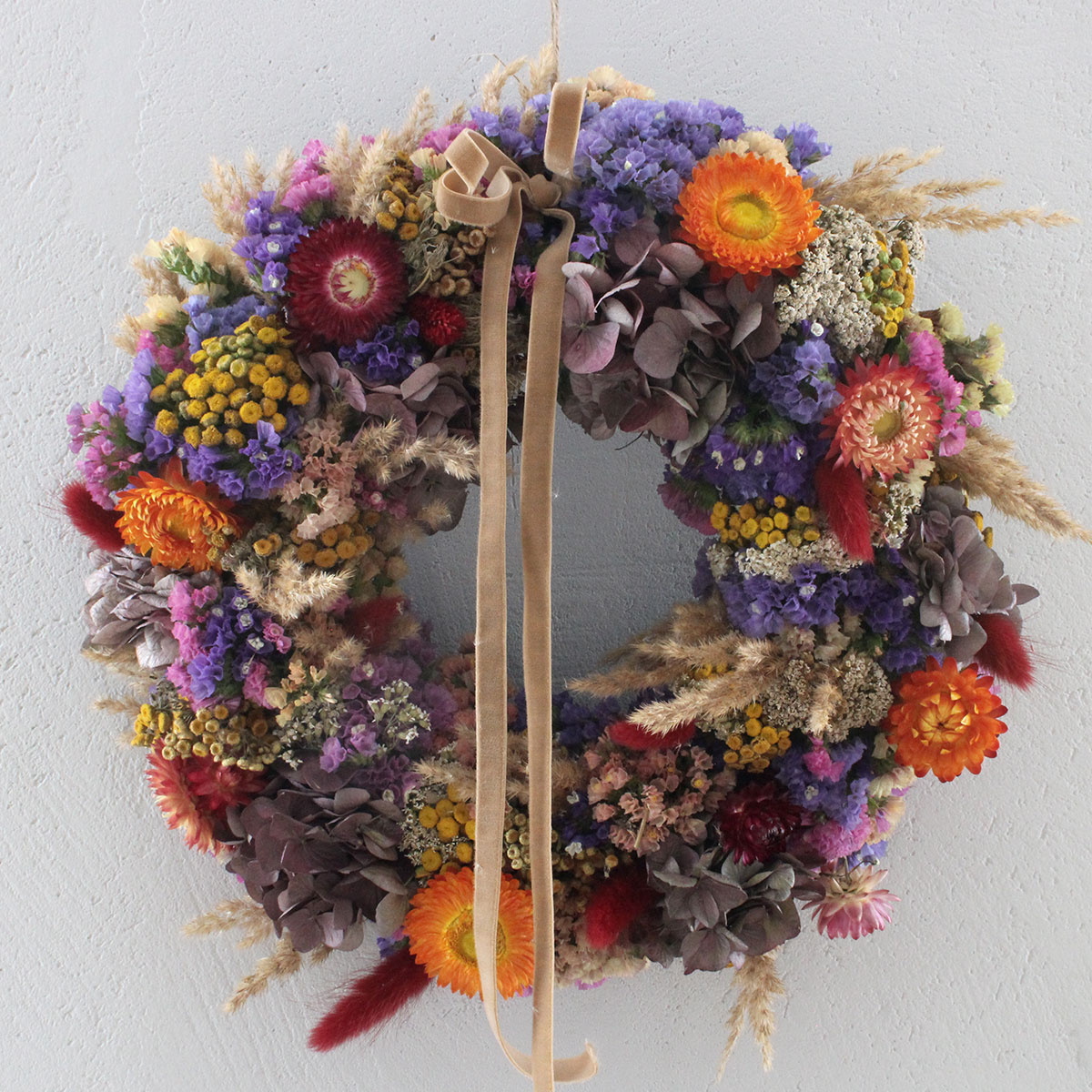Do stworzenia tego wianka wykorzystano suszone trawy, hortensje, zatrwian w odcieniach fioletowym, różowym i łososiowym, bordowy dmuszek, barwne kocanki, krwawnik, wrotycz oraz dziką marchew. Całość została zwięczona aksamitną kokardką w kolorze beżowym, która nadaje dekoracji subtelnej elegancji i sprawia, że prezentuje się niezwykle efektownie.