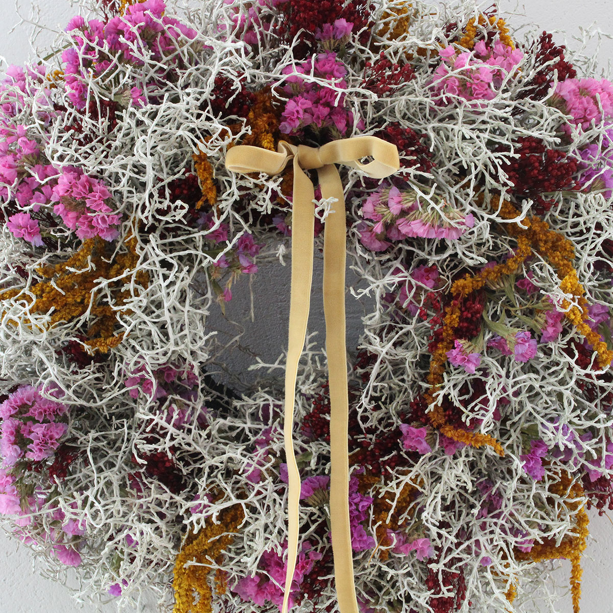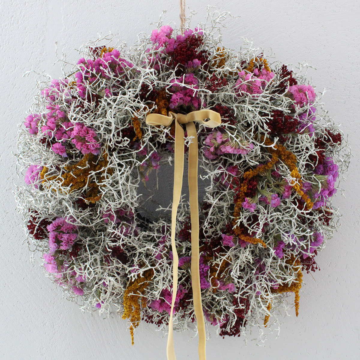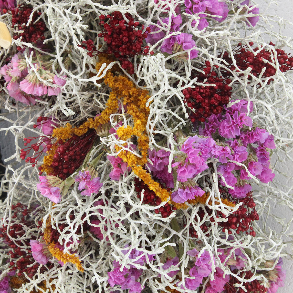 Wianek tworzy drutowiec, który nadaje mu lekkość i ciekawą, przestrzenną formę. Jego jasna barwa pięknie kontrastuje z intensywnymi kolorami kwiatów. Zatrwian w odcieniu różowym dodaje dekoracji świeżości, natomiast amarantus w ciepłym kolorze pomarańczowym wprowadza jesienny nastrój. Z kolei bordowy broom bloom podkreśla głębię i elegancję całej kompozycji. Całość wieńczy aksamitna wstążka, która dopełnia projekt i nadaje mu miękkości.