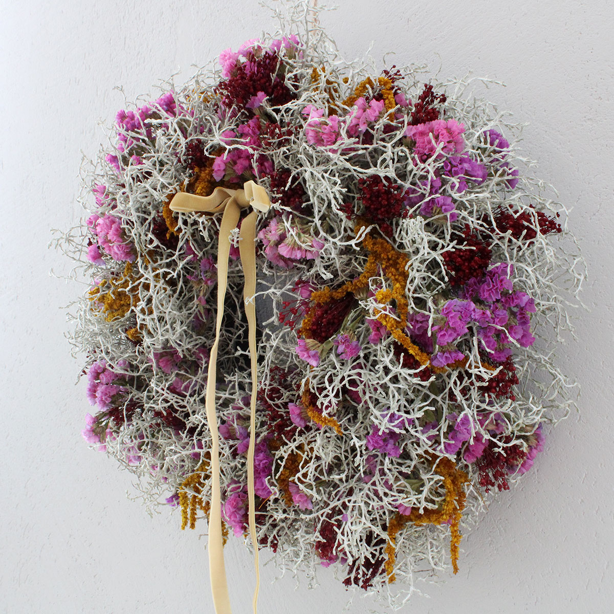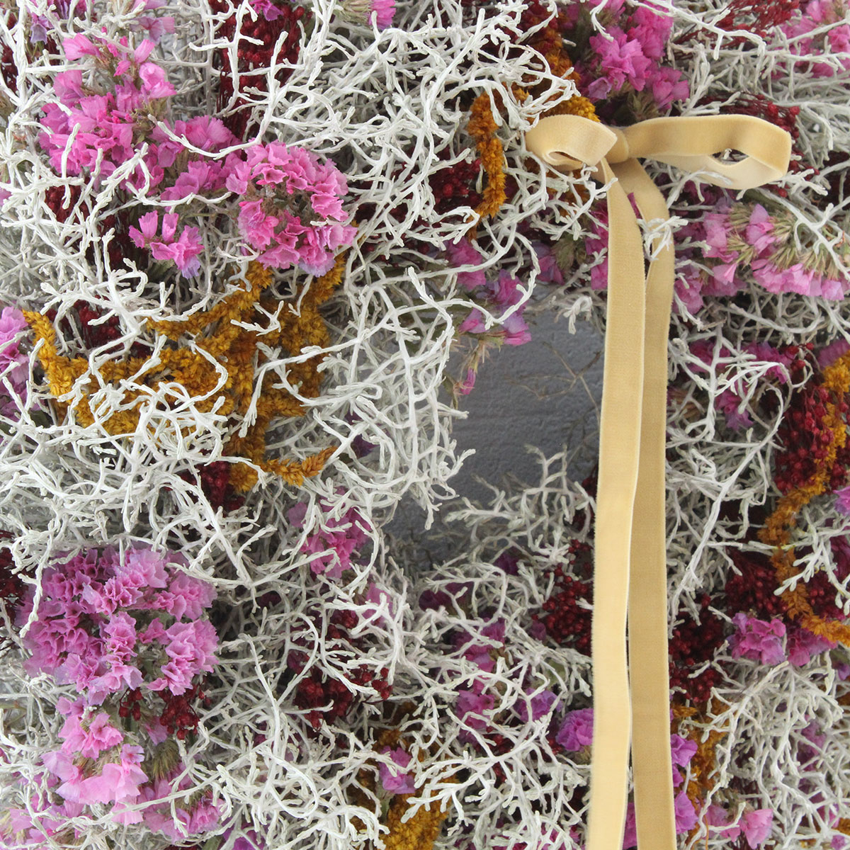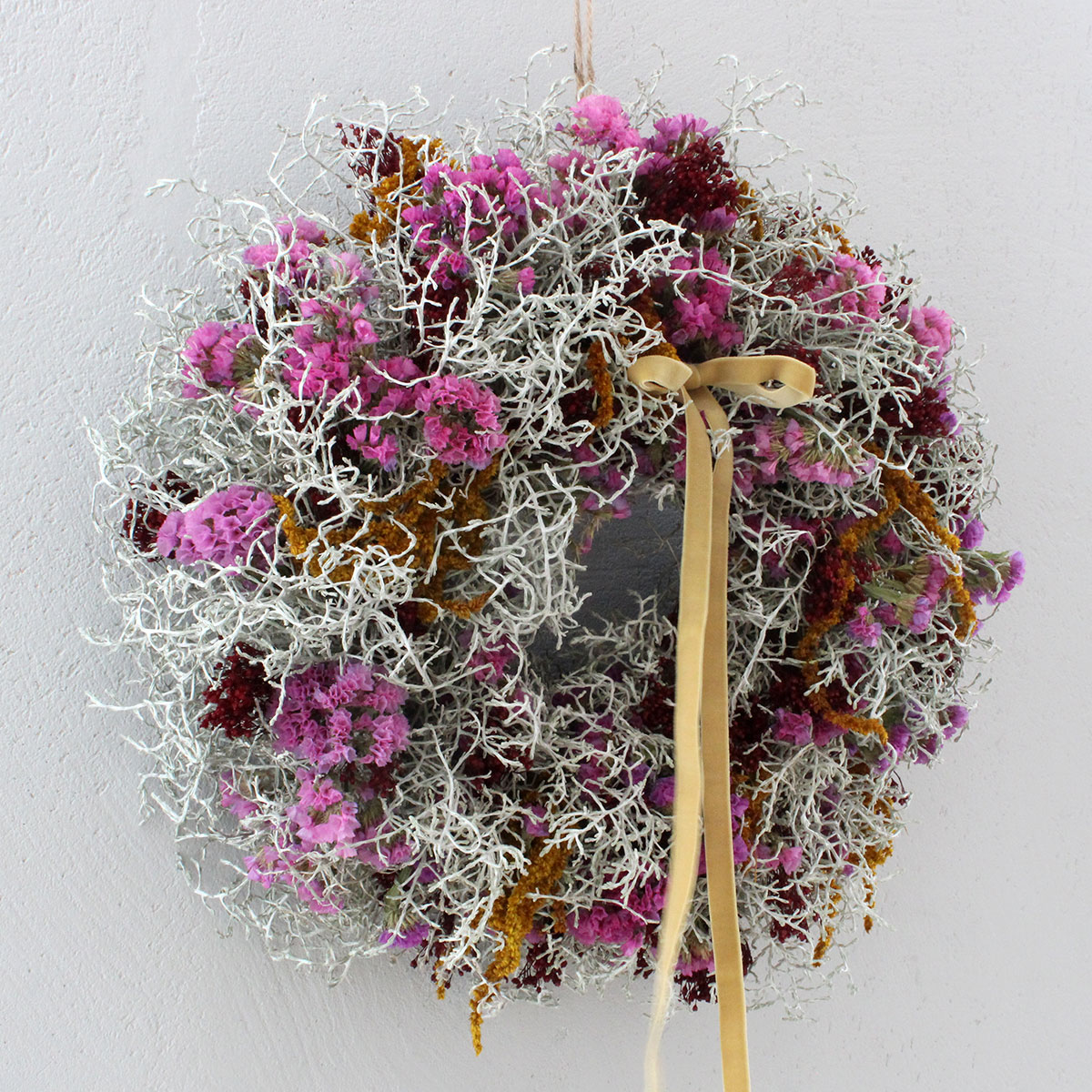 Wianek tworzy drutowiec, który nadaje mu lekkość i ciekawą, przestrzenną formę. Jego jasna barwa pięknie kontrastuje z intensywnymi kolorami kwiatów. Zatrwian w odcieniu różowym dodaje dekoracji świeżości, natomiast amarantus w ciepłym kolorze pomarańczowym wprowadza jesienny nastrój. Z kolei bordowy broom bloom podkreśla głębię i elegancję całej kompozycji. Całość wieńczy aksamitna wstążka, która dopełnia projekt i nadaje mu miękkości.