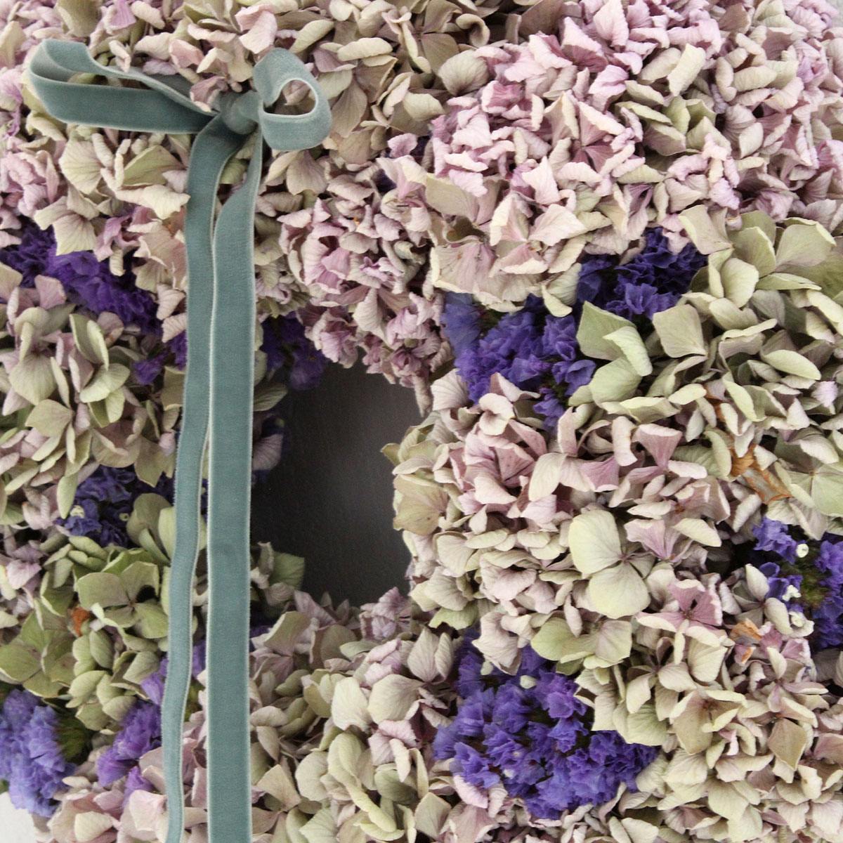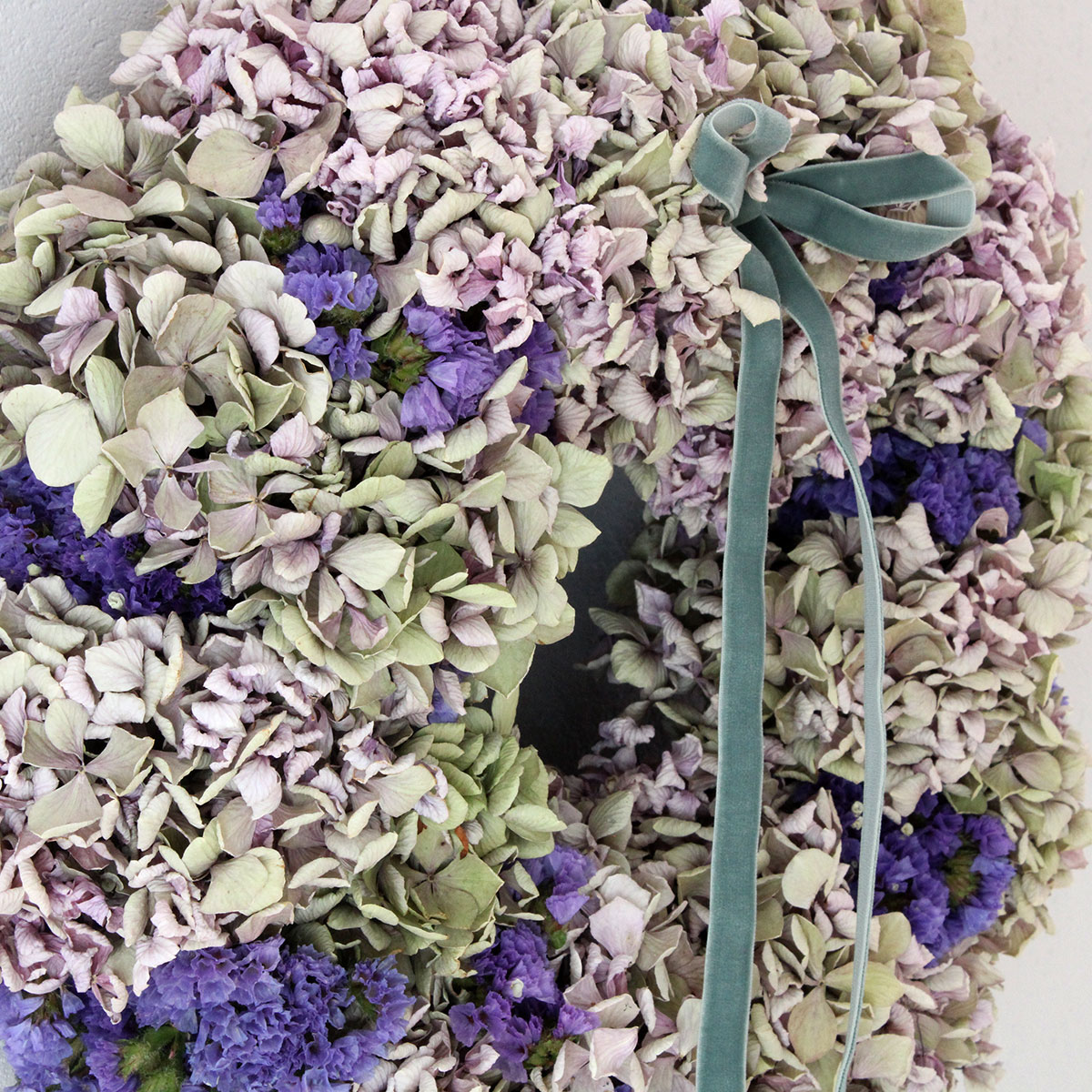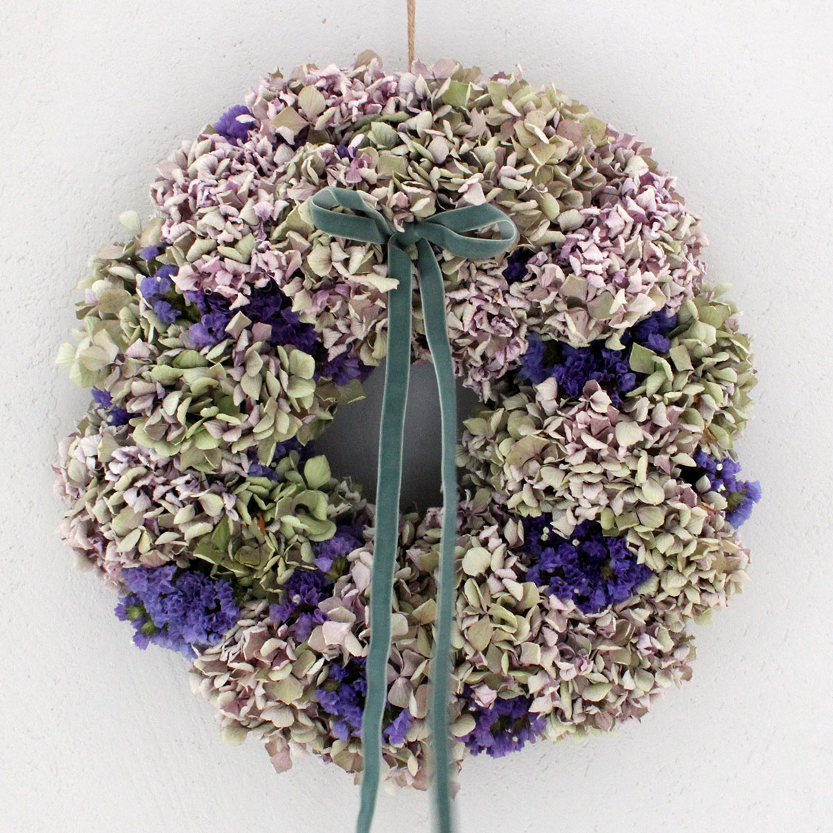 Podstawą kompozycji są suszone kwiatostany hortensji, które nadają wianowi miękkości, objętości i pastelowego charakteru. Ich delikatne barwy pięknie komponują się z fioletowym zatrwianem, który dodaje całości wyrazistości i kontrastu. Wianek z hortensją i zatrwianem doskonale wpisuje się w klimat jesieni, ale jednocześnie pasuje do aranżacji o każdej porze roku.