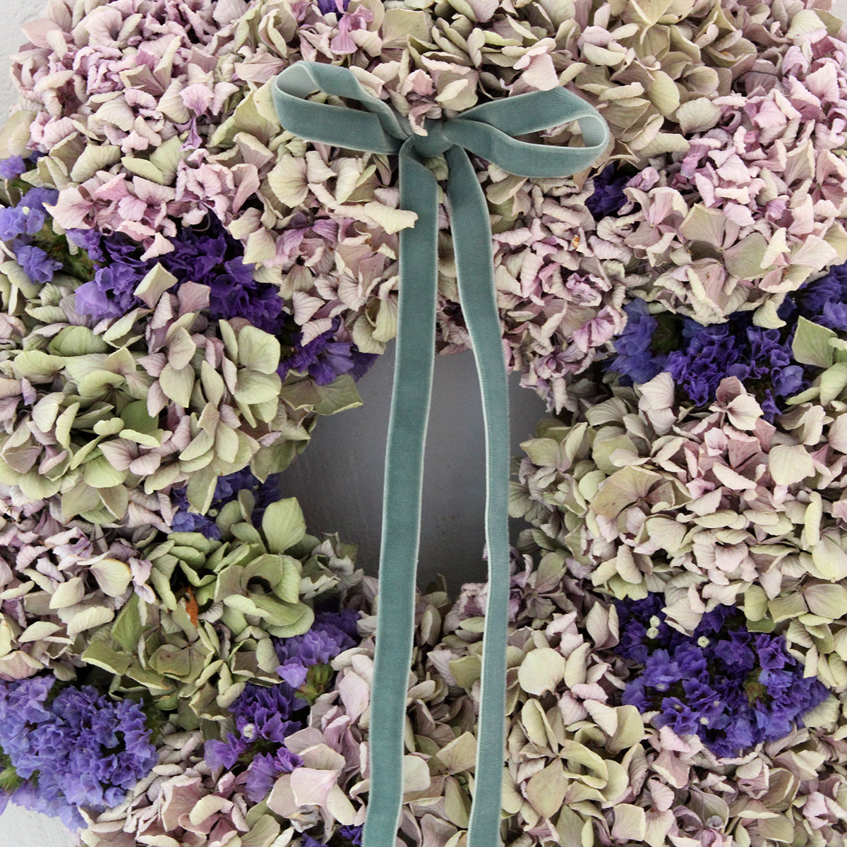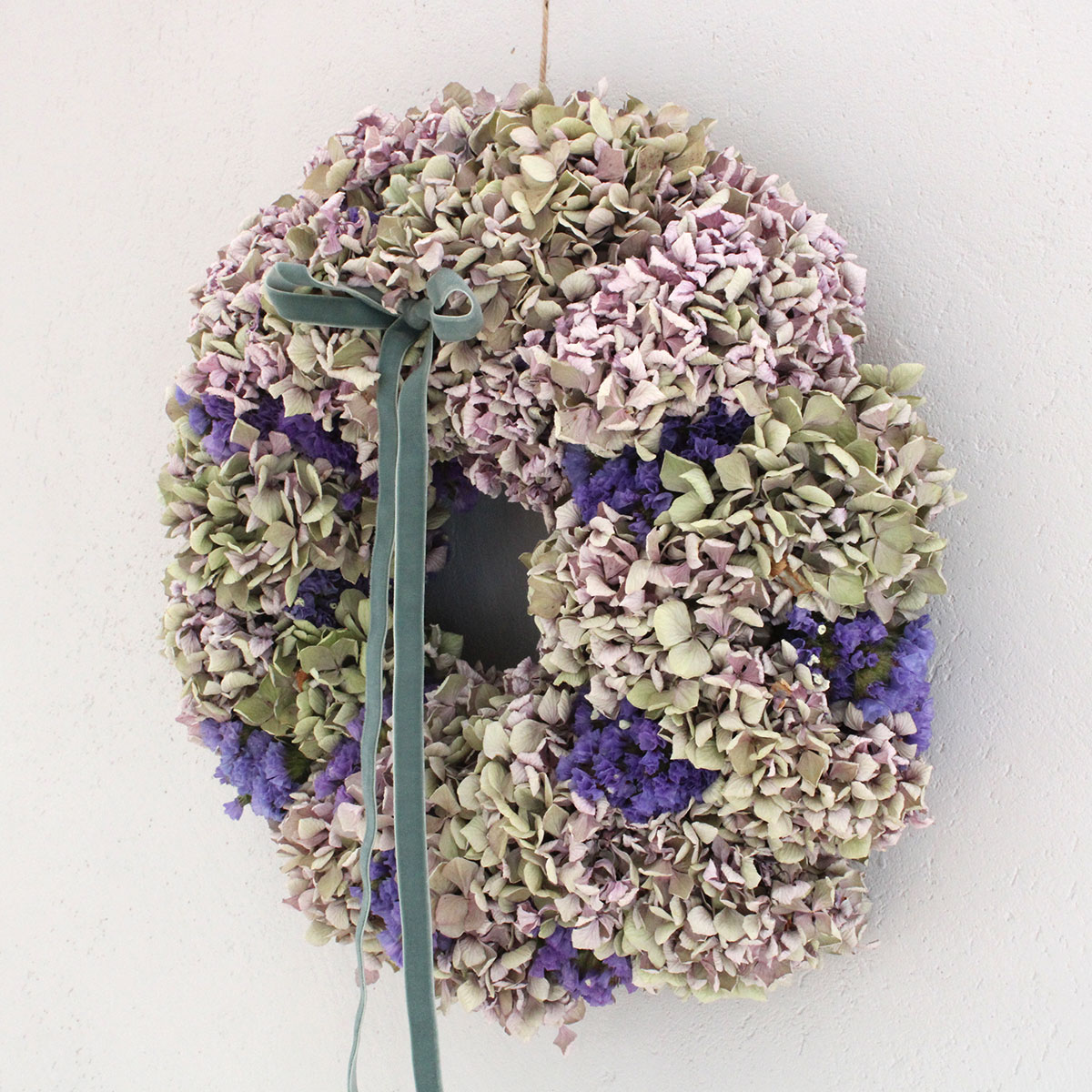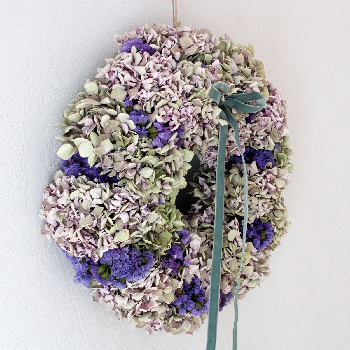 Podstawą kompozycji są suszone kwiatostany hortensji, które nadają wianowi miękkości, objętości i pastelowego charakteru. Ich delikatne barwy pięknie komponują się z fioletowym zatrwianem, który dodaje całości wyrazistości i kontrastu. Wianek z hortensją i zatrwianem doskonale wpisuje się w klimat jesieni, ale jednocześnie pasuje do aranżacji o każdej porze roku.