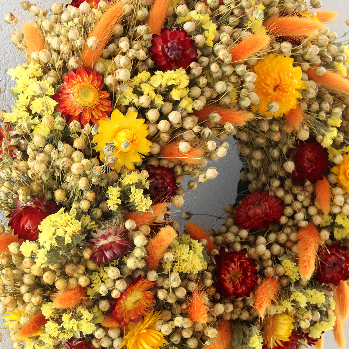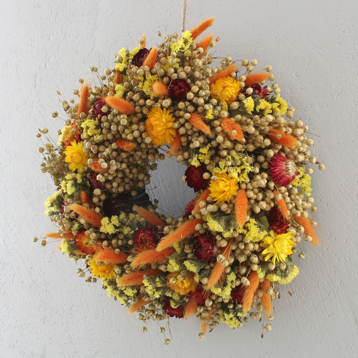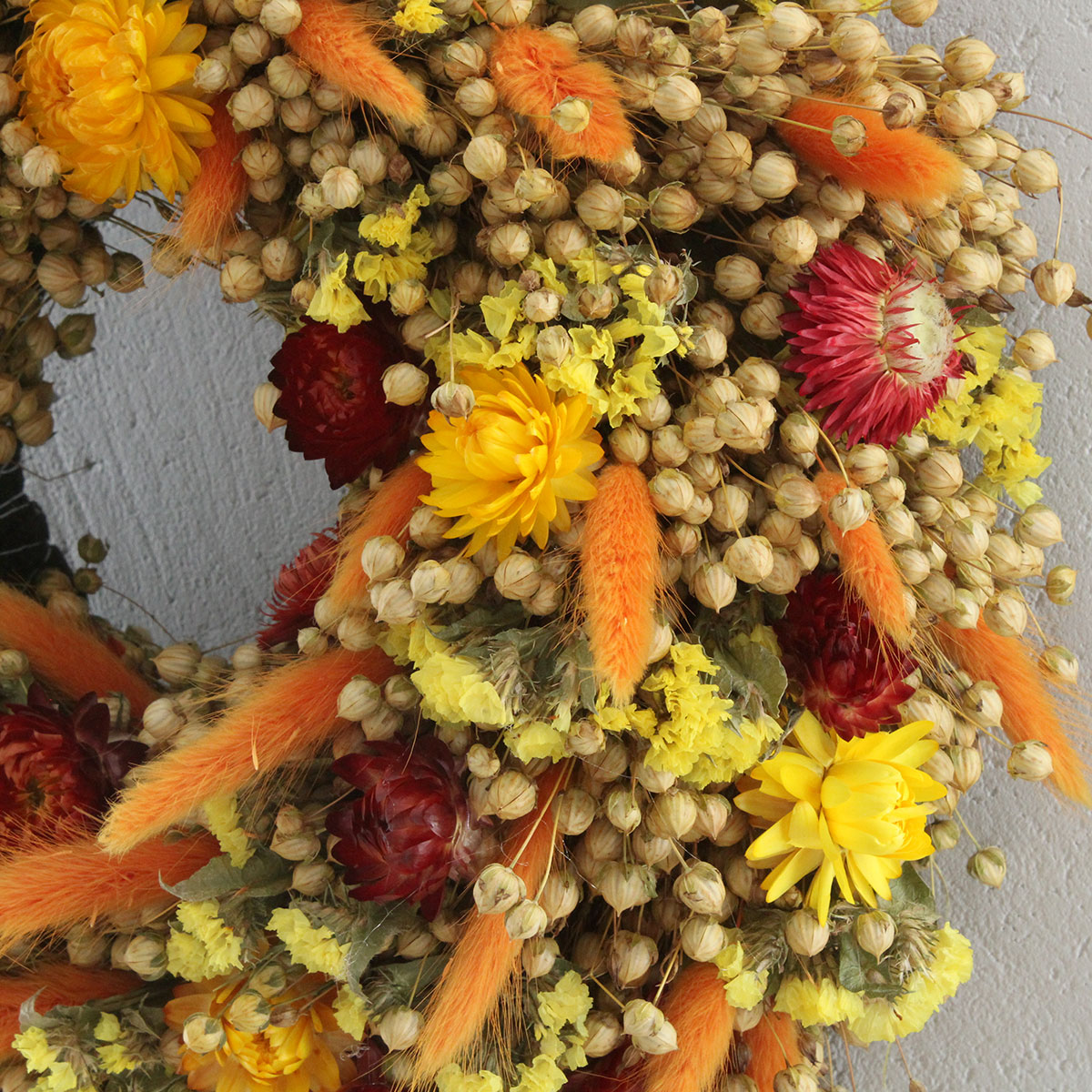 Do stworzenia wianka wykorzystano len, który nadaje mu lekkości i naturalnego charakteru. Całość uzupełniają bordowe i żółte kocanki, które pięknie kontrastują ze sobą i wprowadzają wyraziste akcenty kolorystyczne. Oprócz tego wianek zdobi żółty zatrwian oraz pomarańczowy dmuszek, dlatego całość zyskuje intensywność i radosny, jesienny wyraz. Dzięki tym barwom dekoracja przyciąga uwagę i świetnie wpisuje się w sezonowe aranżacje.