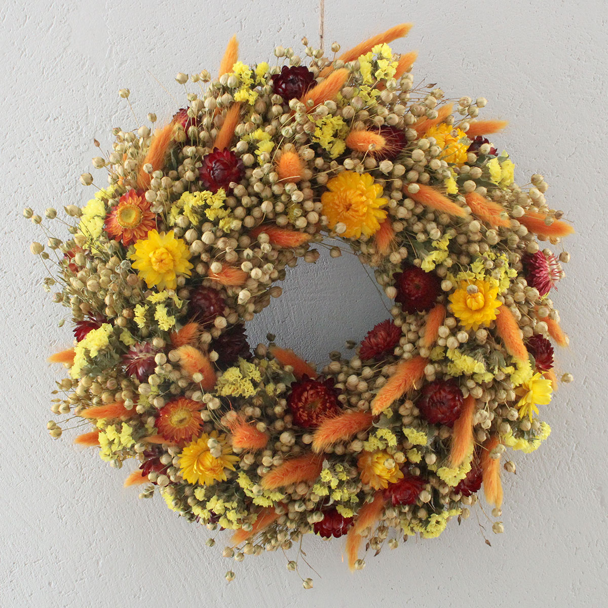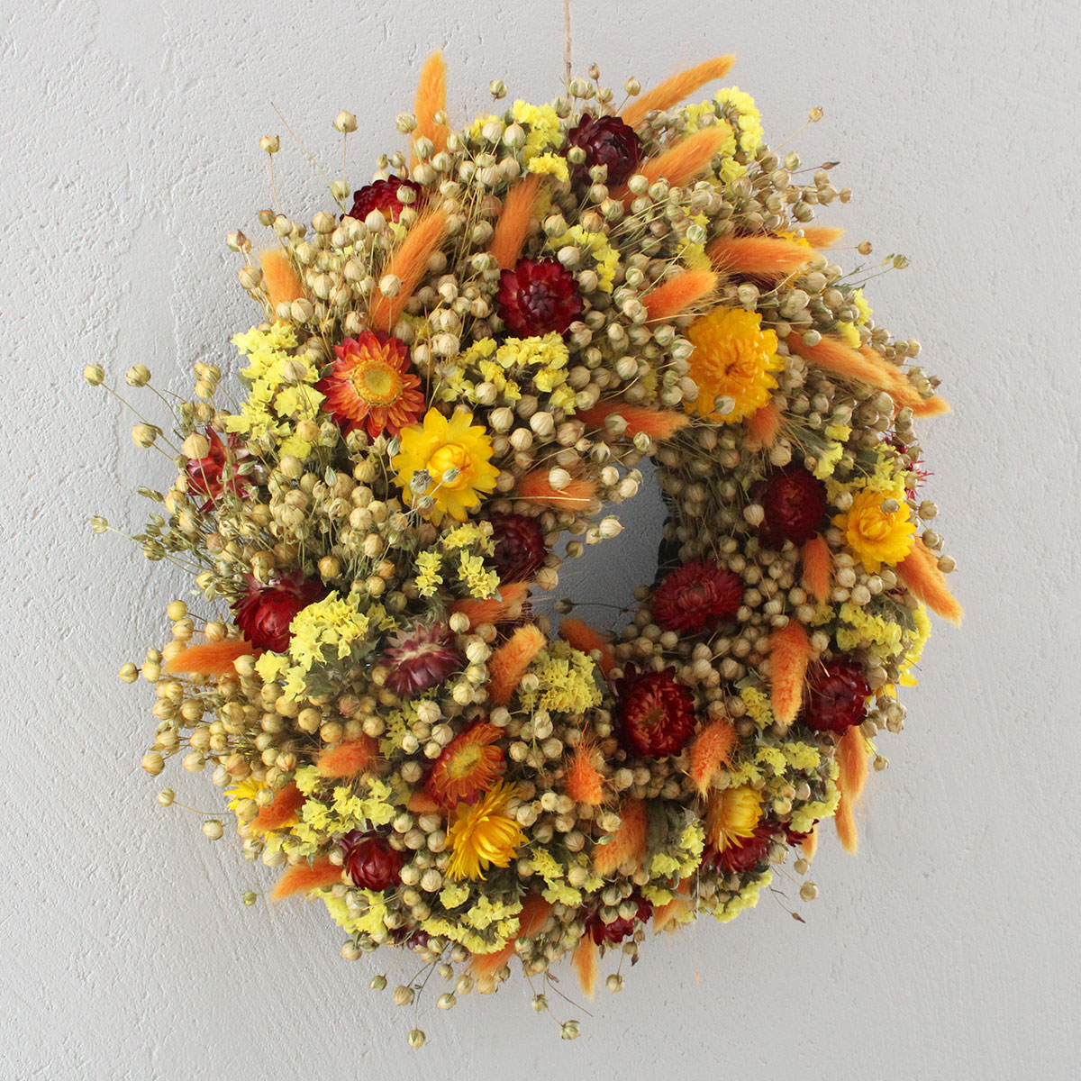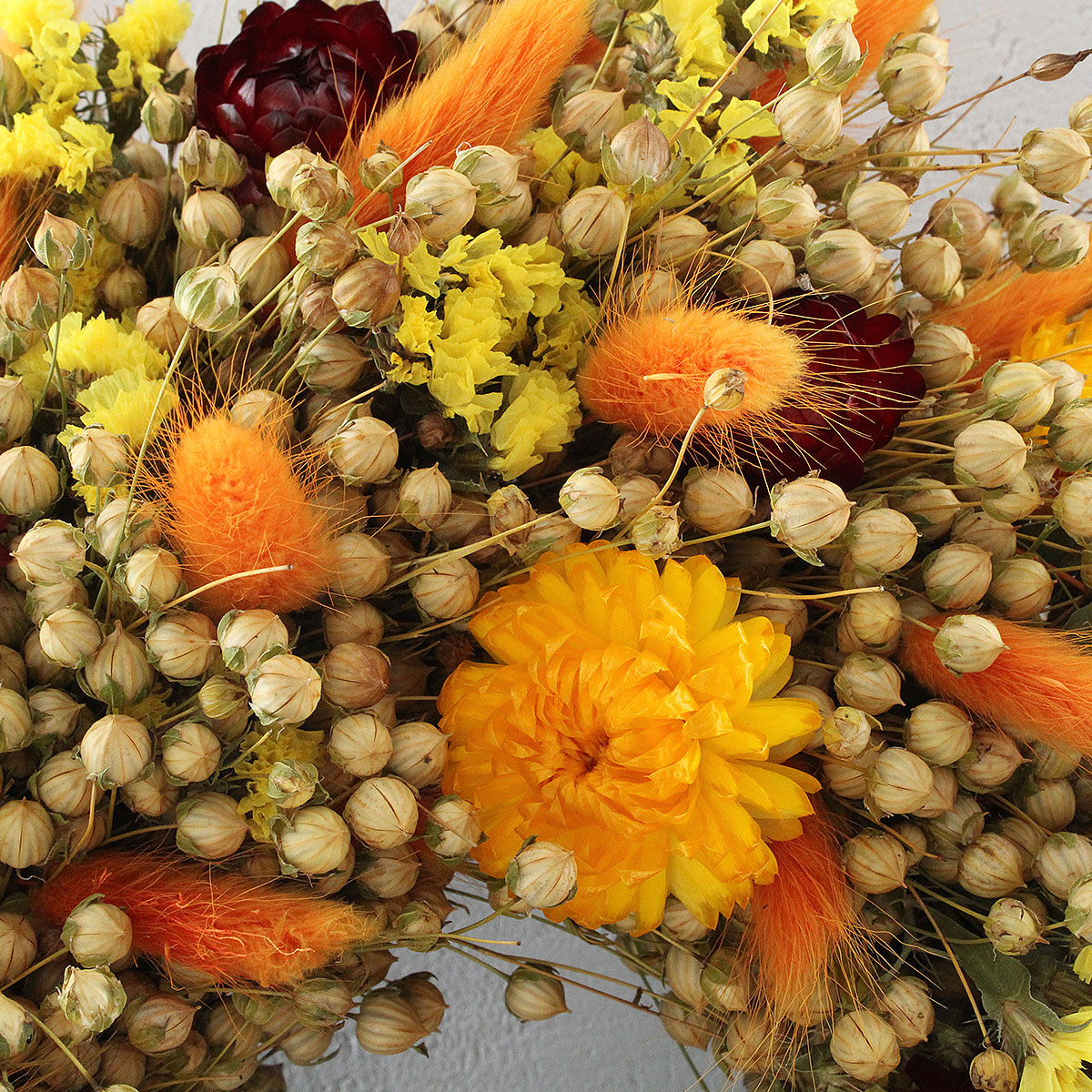 Do stworzenia wianka wykorzystano len, który nadaje mu lekkości i naturalnego charakteru. Całość uzupełniają bordowe i żółte kocanki, które pięknie kontrastują ze sobą i wprowadzają wyraziste akcenty kolorystyczne. Oprócz tego wianek zdobi żółty zatrwian oraz pomarańczowy dmuszek, dlatego całość zyskuje intensywność i radosny, jesienny wyraz. Dzięki tym barwom dekoracja przyciąga uwagę i świetnie wpisuje się w sezonowe aranżacje.