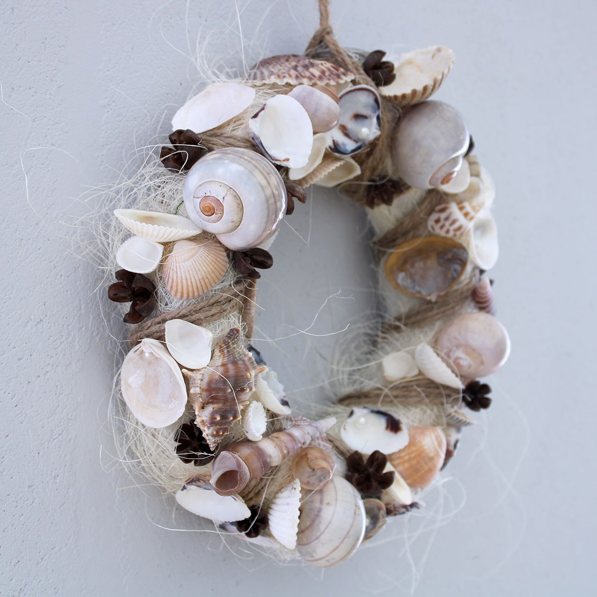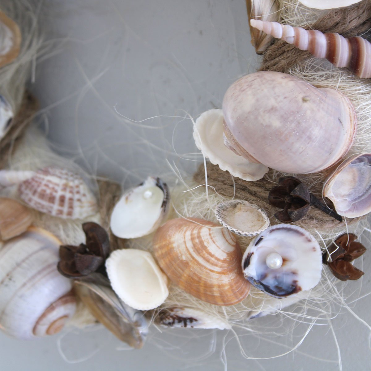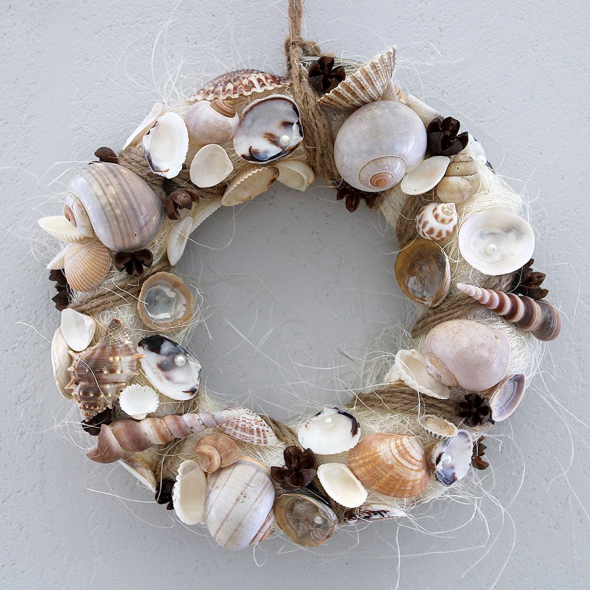 Wianek z muszelek o średnicy ok 26 cm. Wykonany z różnego rodzaju i wielkości naturalnych muszli, koralików – perełek i sizalu oraz suszu egzotycznego. Całość kompozycji utrzymana w jasnej kolorystyce. Jest to piękna dekoracja drzwi, ale również stołu.