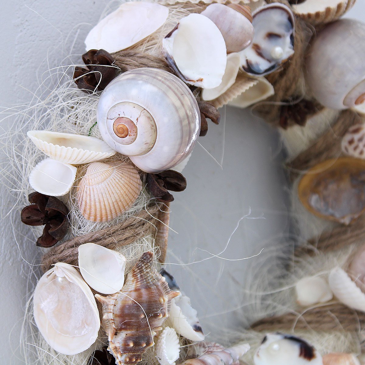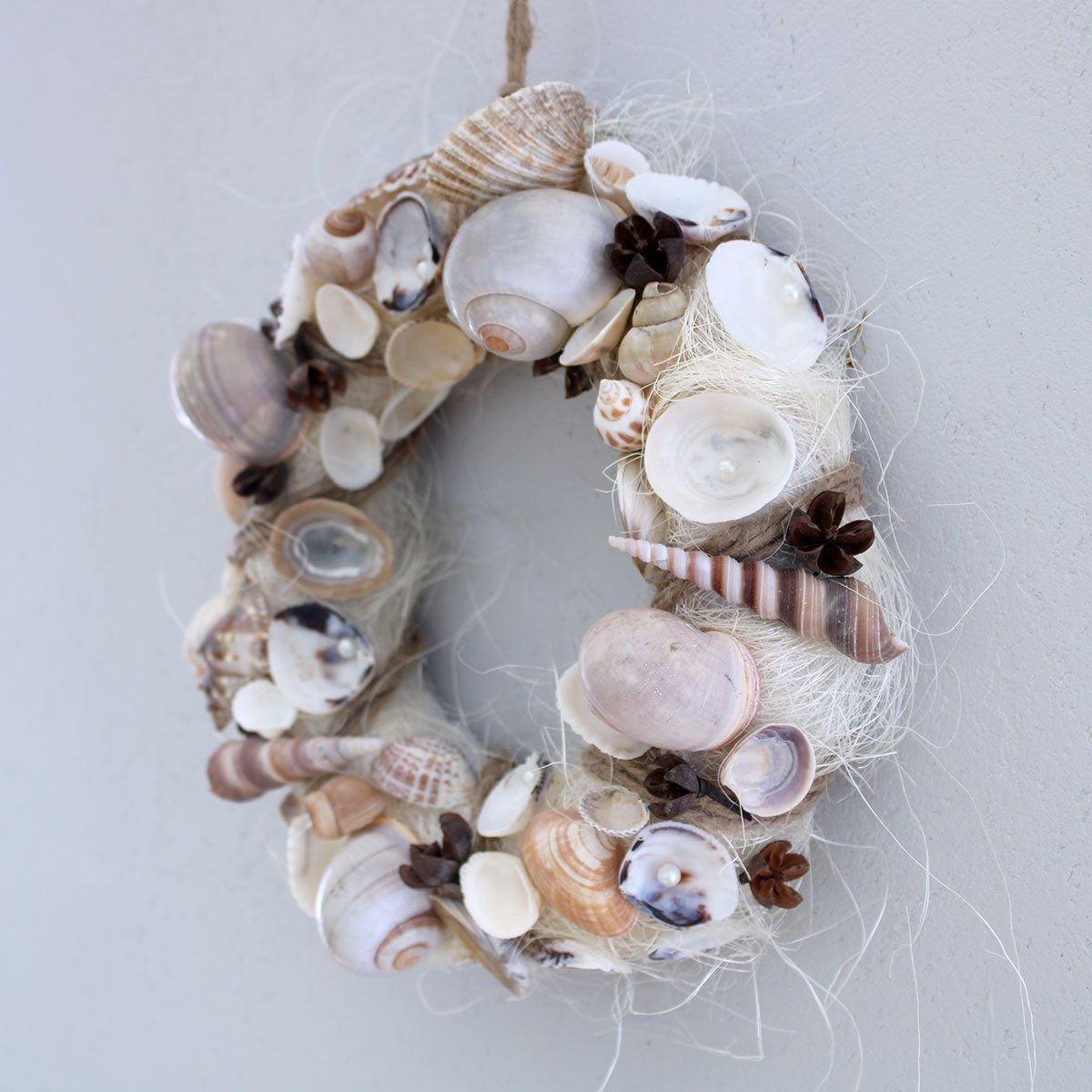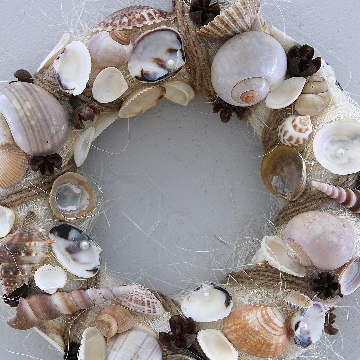 Wianek z muszelek o średnicy ok 26 cm. Wykonany z różnego rodzaju i wielkości naturalnych muszli, koralików – perełek i sizalu oraz suszu egzotycznego. Całość kompozycji utrzymana w jasnej kolorystyce. Jest to piękna dekoracja drzwi, ale również stołu.